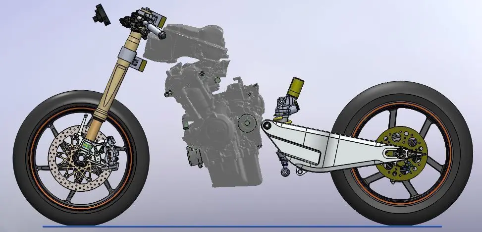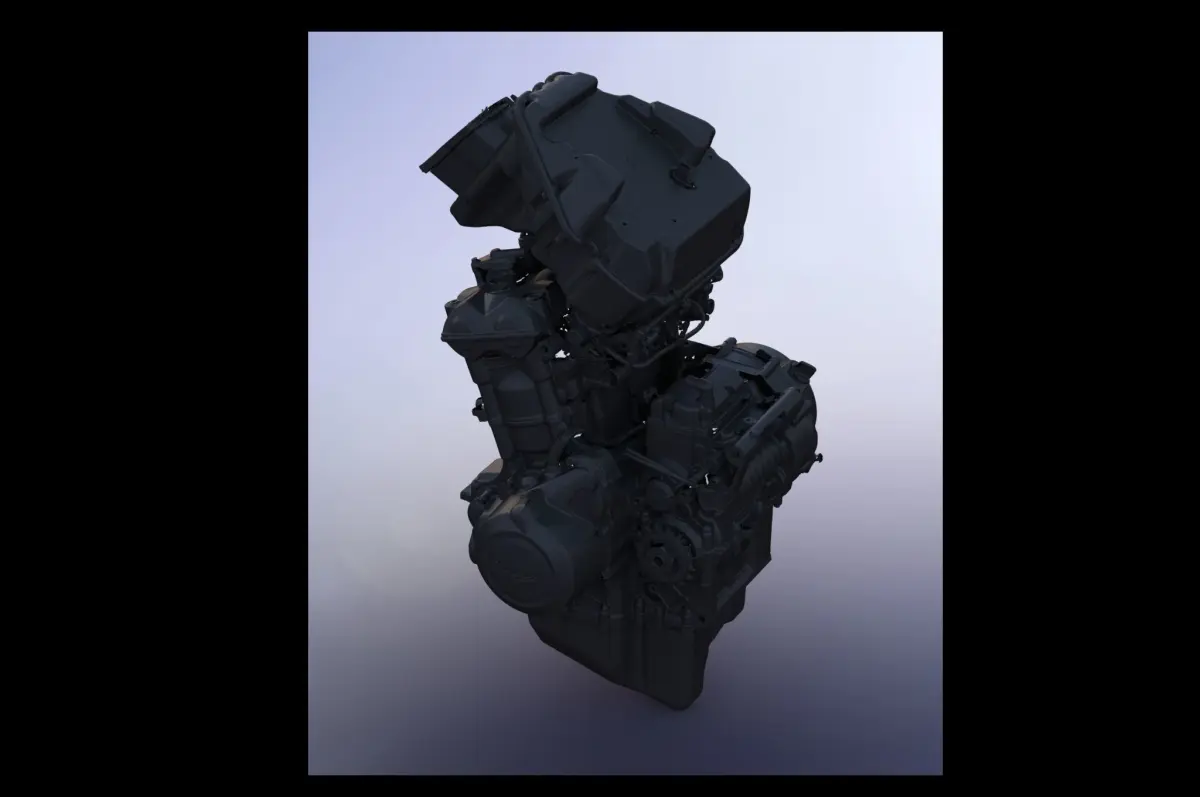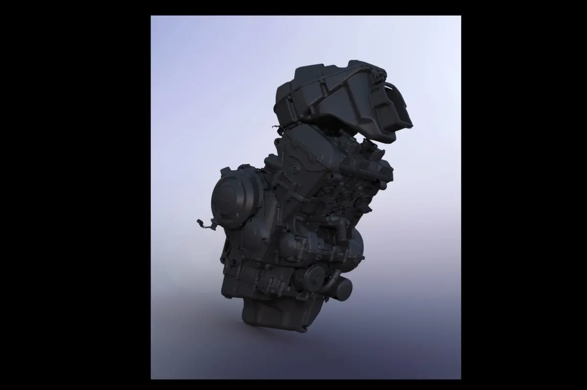 Triumph Street Triple engine from 3D scan. This engine is the same as the Daytona 675 and the moto2 765 but the airbox is different in both cases. This model is accurate enough to use for FSAE or motorcyle design, the SolidWorks assy has solid parts for engine mounts, output sprocket, water connections etc shown in blue on the pictures.