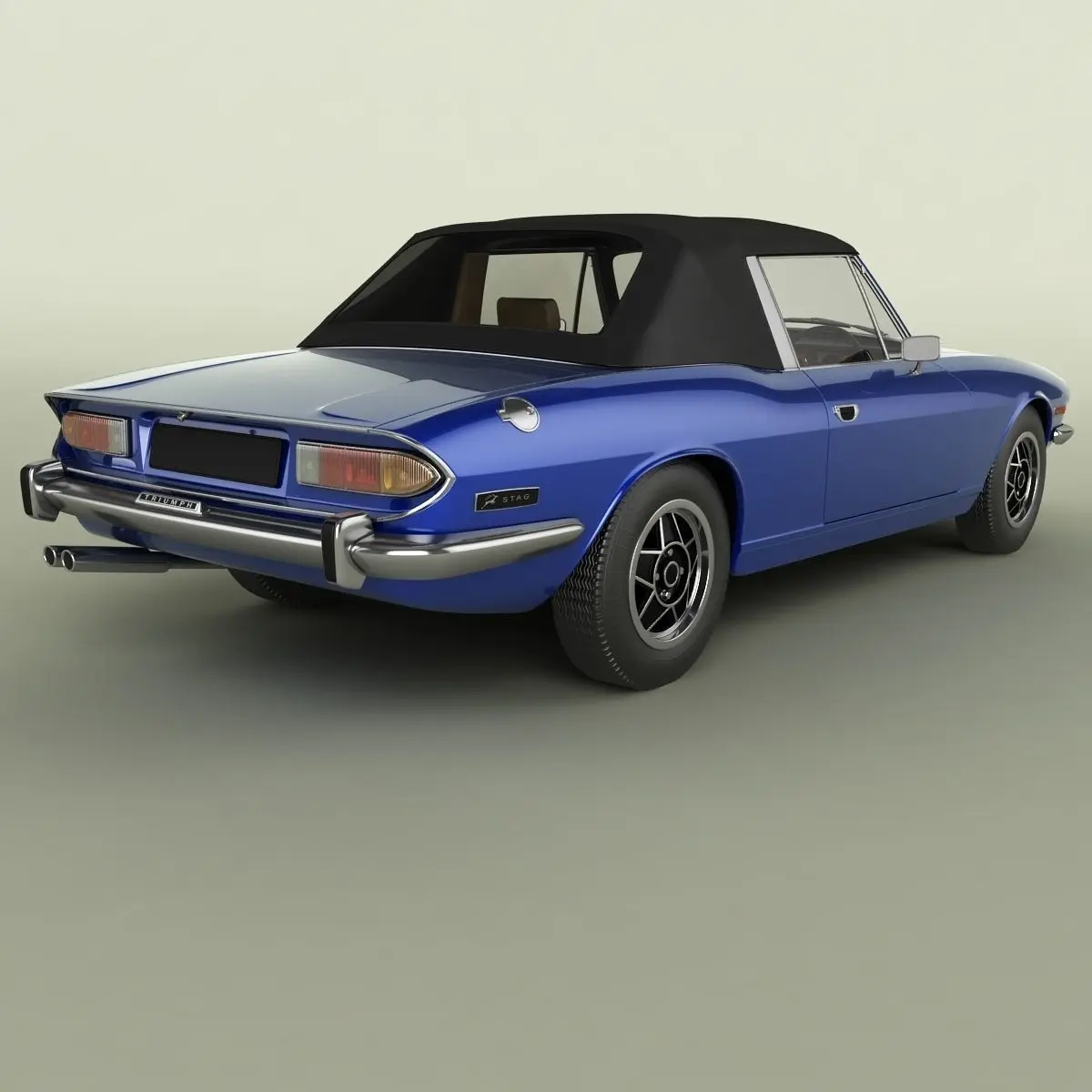 High detailed, correctly scaled model of 1970 Triumph Stag styled by Michelotti. Originally created with 3ds Max 8. Rendered with V-Ray, files with standard materials are included. Unit system is set to metric units. Model is built to real-world scale. Geometry is Editable Poly (quads/tris only). TurboSmooth is use separately to objects (89 of 152 named objects) with iterations 2 (983936 polys, 552145 vert.) Each file was checked before upload. Materials and textures are included (7 textures - jpg 1024X1024).