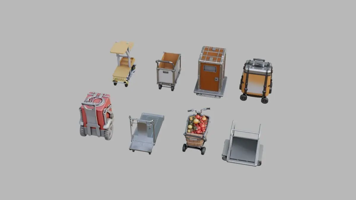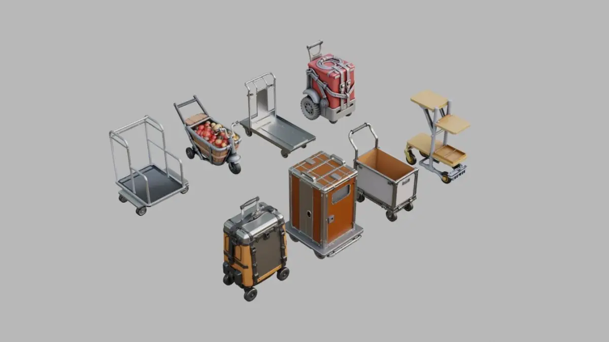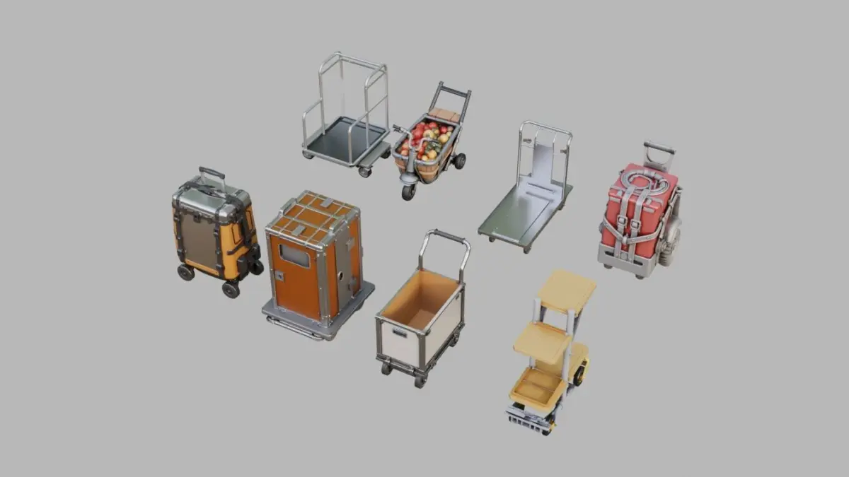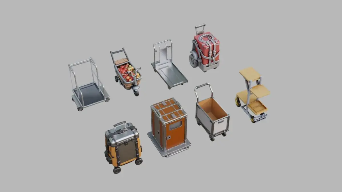 Upgrade your scenes with this detailed 3D Models Trolleys Pack Collection, featuring a wide variety of high-quality trolley models designed for industrial, commercial, and utility purposes. This versatile pack includes different types of trolleys such as platform trolleys, hand trucks, warehouse carts, utility trolleys, and transport dollies — ideal for factory setups, logistics simulations, retail environments, and game development.