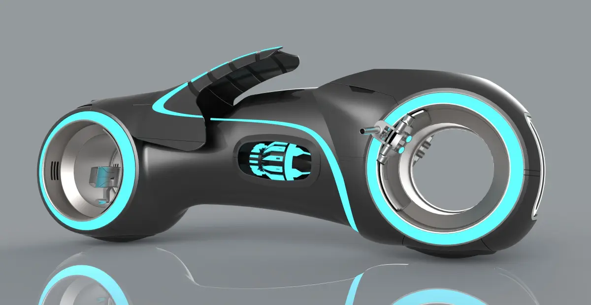 5th generation light cycles are not persistent. They are generated from a baton, with the baton splitting in half and forming the light cycle between the two halves and below the rider. The remaining halves of the baton also form the handlebars of the light cycle. When creating a light cycle from a baton, the rider typically does so with a running leap to assume the necessary posture, and clearance from the ground, to allow the light cycle to form.Model dimensions: - length - 2820 mm - width - 1094 mm - height - 1097 mmInformation links: http://www.disney.co.uk/tron/light-cycle.jsp#/vehicles http://danielsimon.com/tron-legacy-light-cycle/
