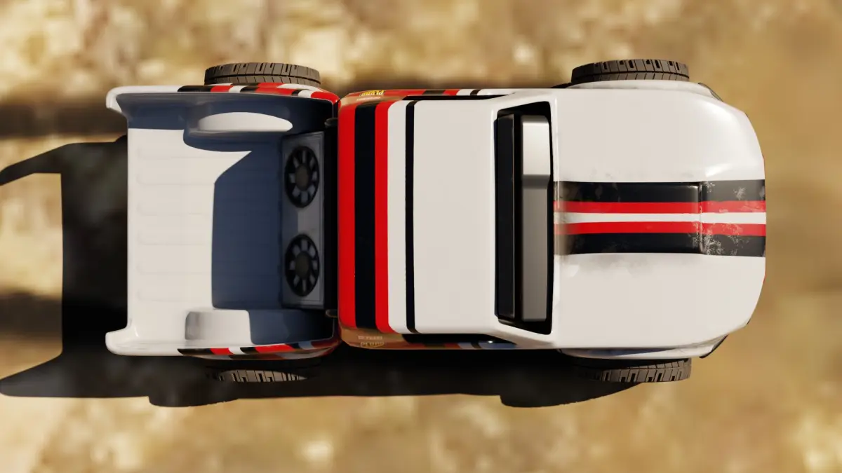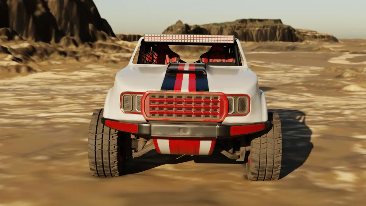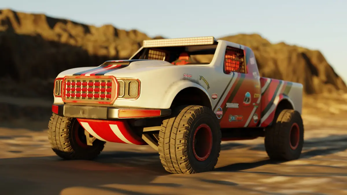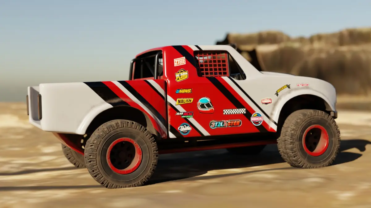 3d model of a sleek trophy truck with a vibrant red and white color scheme, adorned with sponsor logos along the sides.The model comes with 1-4k resolution texture packs.