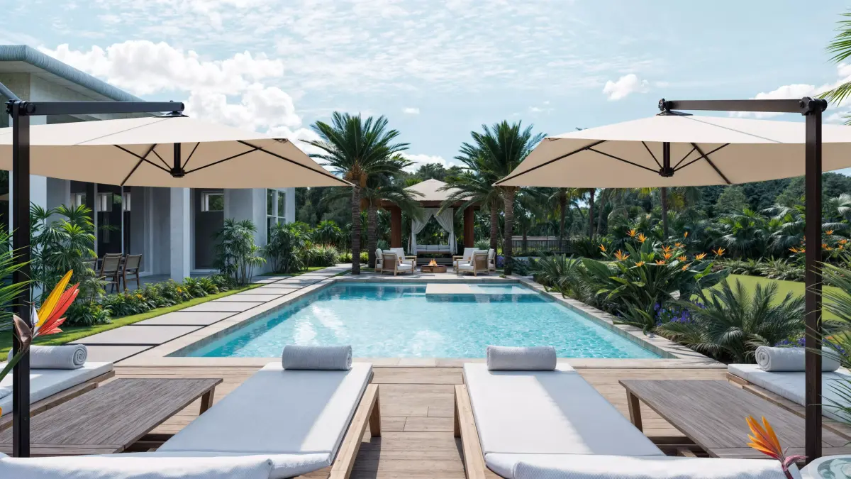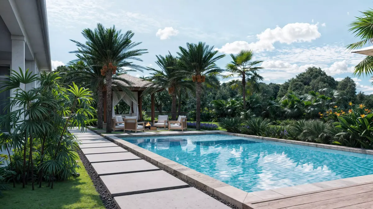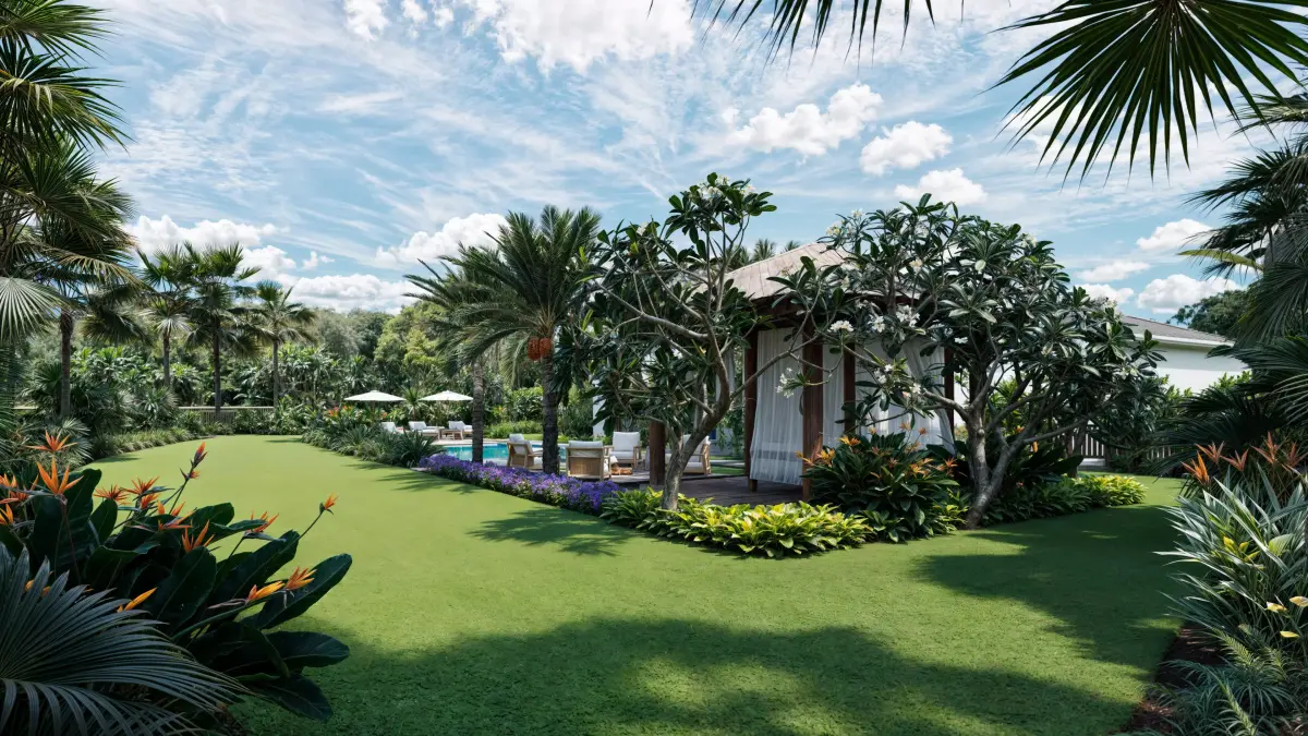 This is a high quality tropical backyard exterior scene created for professional exterior and landscape visualization. The environment features a complete multi layer vegetation system with carefully selected models representing authentic tropical plant structure. The garden includes ground cover plants, low shrubs, mid height tropical species, and tall canopy trees arranged to achieve a natural, balanced, and visually rich composition.