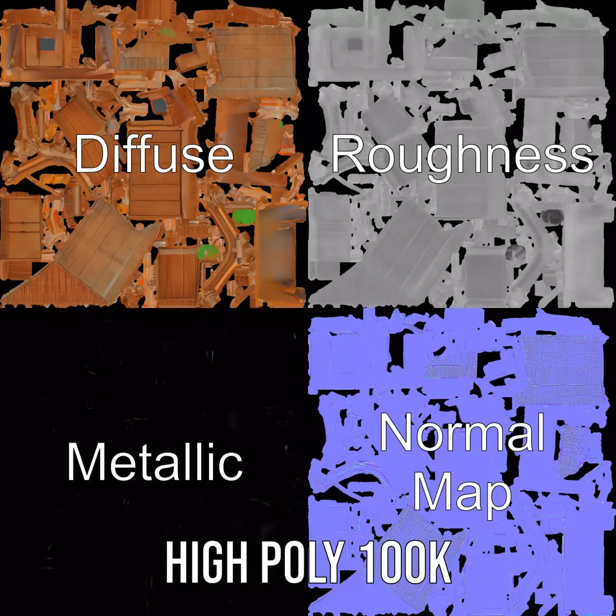 This Tropical Bamboo Bungalow model pack offers a stunning representation of a rustic island retreat, perfect for enhancing beach or tropical scenes in games, films, or architectural visualizations. Each model has 3 levels of detail: low-poly (1000 triangles for mobile), middle-poly (10,000 triangles for environment), and high-poly (100,000 triangles), which allows for the use of this model in production rendering (such as 3ds Max, Maya, Cinema4D, Blender, Vray/Corona/Cycles, and all others), game engines (Unity and Unreal compatible), and interactive presentations, providing a choice of detail based on the LOD System principle. Featuring natural bamboo textures and a thatched roof, this model adds authenticity and warmth to any project. The model's textures are PBR, Diffuse, NormalMap, and reflection/roughness/metallic, which are suitable for any modern rendering engine. All models are accurately unwrapped with no overlapping UVs. All textures are 4096*4096 in size. If you like this model, be sure to leave a comment and like it.