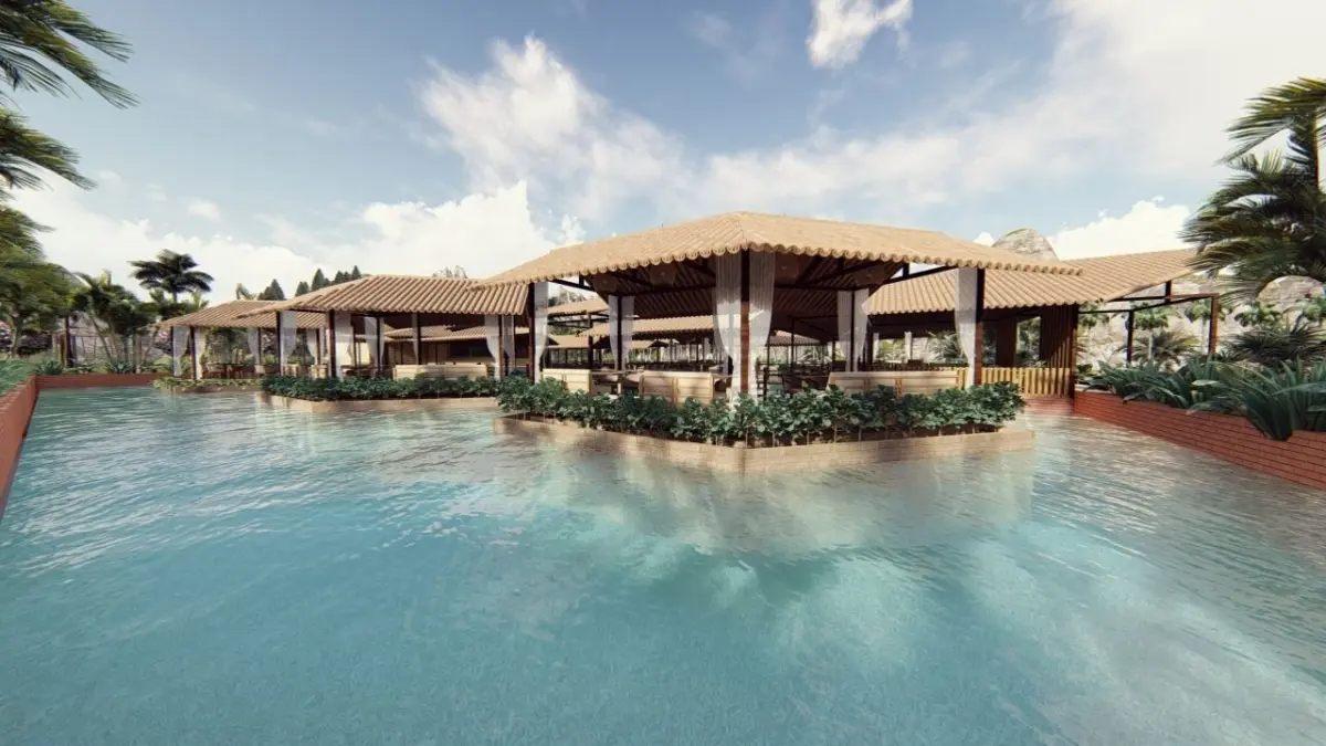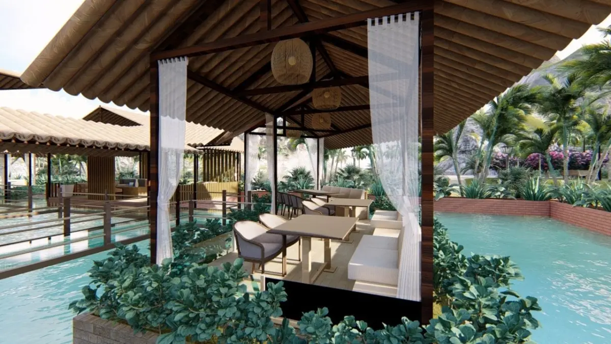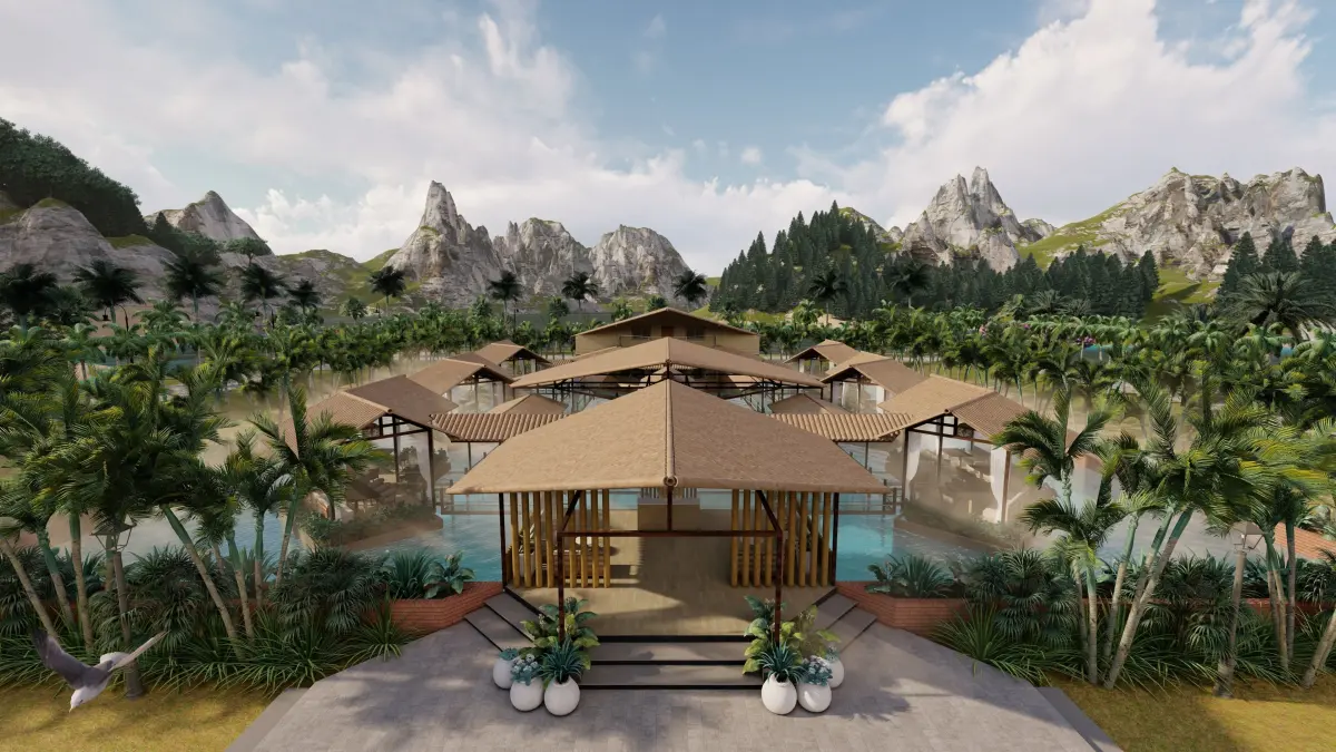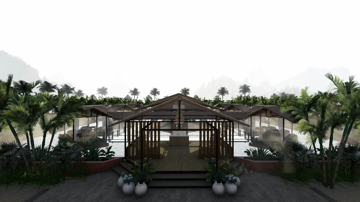 The restaurant is made on an artificial water pond that functions as a natural air-conditioner. Making use of the pond is essential concerning the hot and humid weather during the summer.The space is naturally cross ventilated and cooled by evaporation of water .The application of open space and using natural materials meets the required tropical connection ,the indoor space ascends to the outdoor space creating rich spatial experience for visitors, they can feel both the interior inside bamboo structure and exterior space consisting pond and greenery at the same time