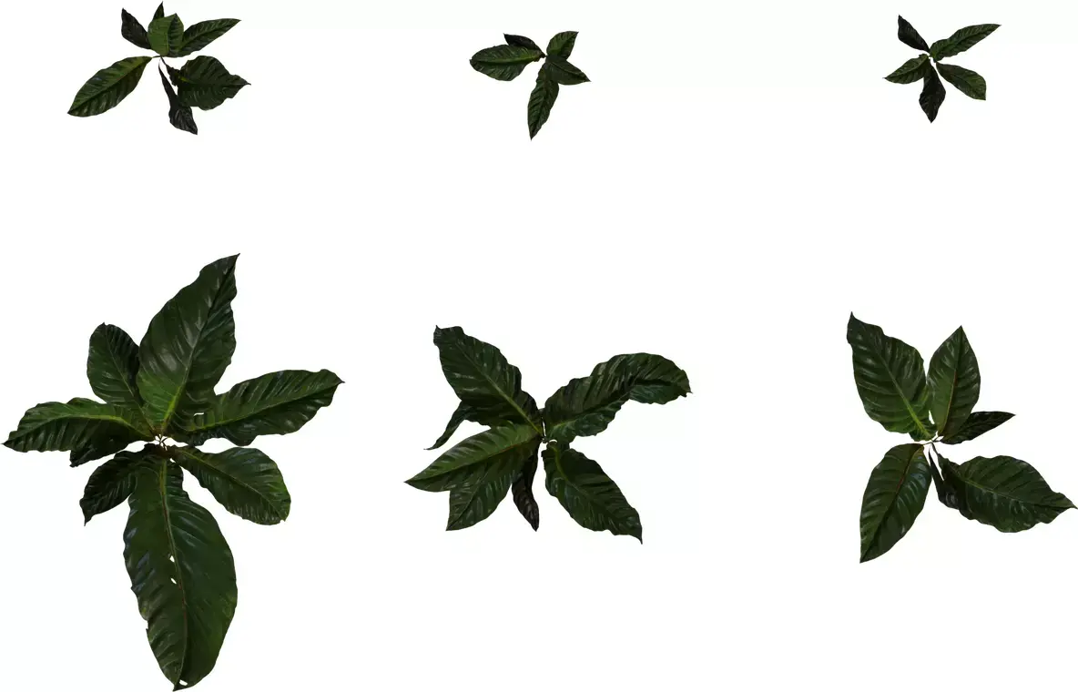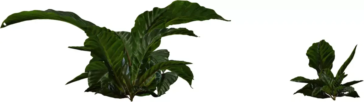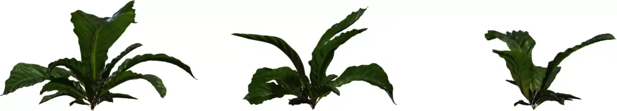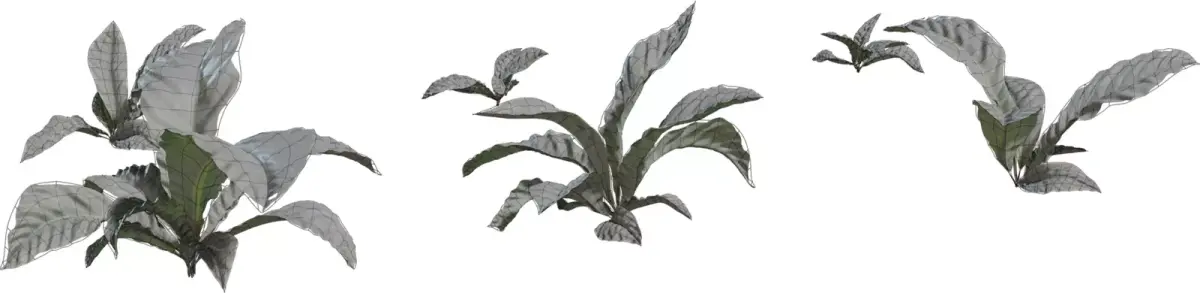 This pack contains several variations of lush, broadleaf tropical plants designed as low ground clumps for jungle, indoor planter, and courtyard scenes. Each model features long, slightly curled leaves with a glossy surface and strong central veins, giving a convincing sense of volume from both side and top views. The meshes are optimized with clean topology and moderate polygon counts, making them suitable for real‑time engines while still holding up in close‑up shots. PBR textures include color, roughness, and normal maps that capture subtle specular highlights and leaf shading for realistic response under different lighting conditions. Assets are UV‑unwrapped and grouped for easy import, material assignment, and instancing inside major DCC tools and game engines. These tropical leaf clumps work well as undergrowth, potted decor, or hero foliage accents in archviz, games, and cinematic environments.