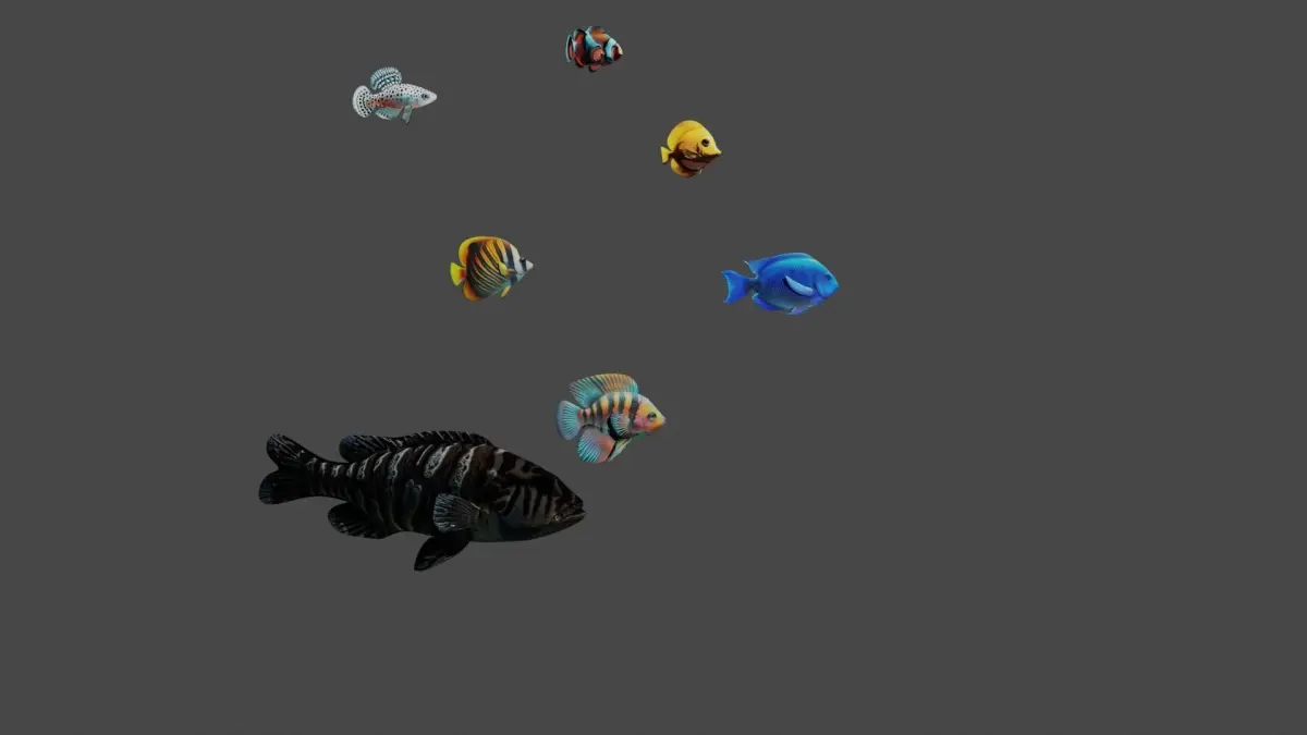 tropical fishThere are 7 low poly fish. These objects blender 3.6.7. LTS was also prepared. I prepared the texture covering of the fish myself. Textures were completely prepared by me. Also is ready Rigged . The empty object is assigned to the parent. You can use it as you wish. Thanks to the low polygon count, you can render quickly.Additionally, a blender document containing an animation video of the fish has been added. The ground object in the animation is provided royalty-free. Ocean surface light effect prepared by me. Added an object with animated colors to the background. these are available in blender's animation file.