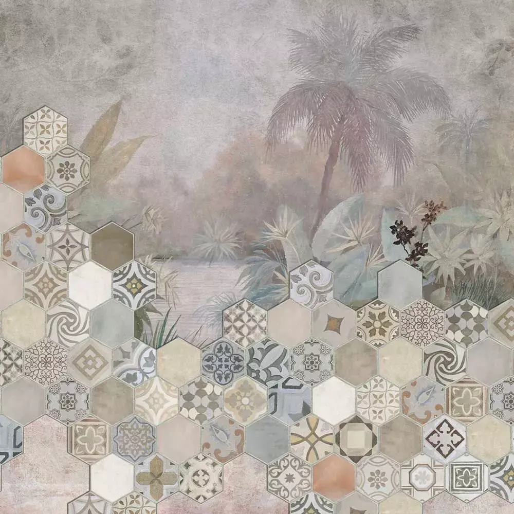 Create a spa‑calm focal wall with this Tropical Hex Tile Oasis Wallpaper Texture. A soft jungle fresco with palms and broad leaves fades into a weathered plaster sky, while the foreground rises into a mosaic of patterned hex tiles in warm neutrals, sage, clay, and misty blues. Ideal for bathrooms, kitchens, restaurants, and wellness spaces, the design balances serene negative space with intricate tile detail that reads beautifully at both distance and close‑up. Delivered as seamless 4K textures with a complete metal/rough PBR set: BaseColor (sRGB), Normal (OpenGL), Roughness, Ambient Occlusion, and Height/Displacement. Maps are aligned, consistently named, and optimized for large‑area tiling in Blender, 3ds Max, Maya, Cinema 4D, Unreal Engine, and Unity. Start at 1 m per UV unit and adjust framing to keep the jungle horizon and tile edge composed. Use Roughness and Normal/Height to emulate matte limewash, tile grout relief, and subtle glazed accents while remaining performant for real‑time scenes. Original artwork created specifically for visualization; no third‑party stock elements. Pair with brushed brass fixtures, terrazzo, and soft greenery for a resort‑inspired interior.