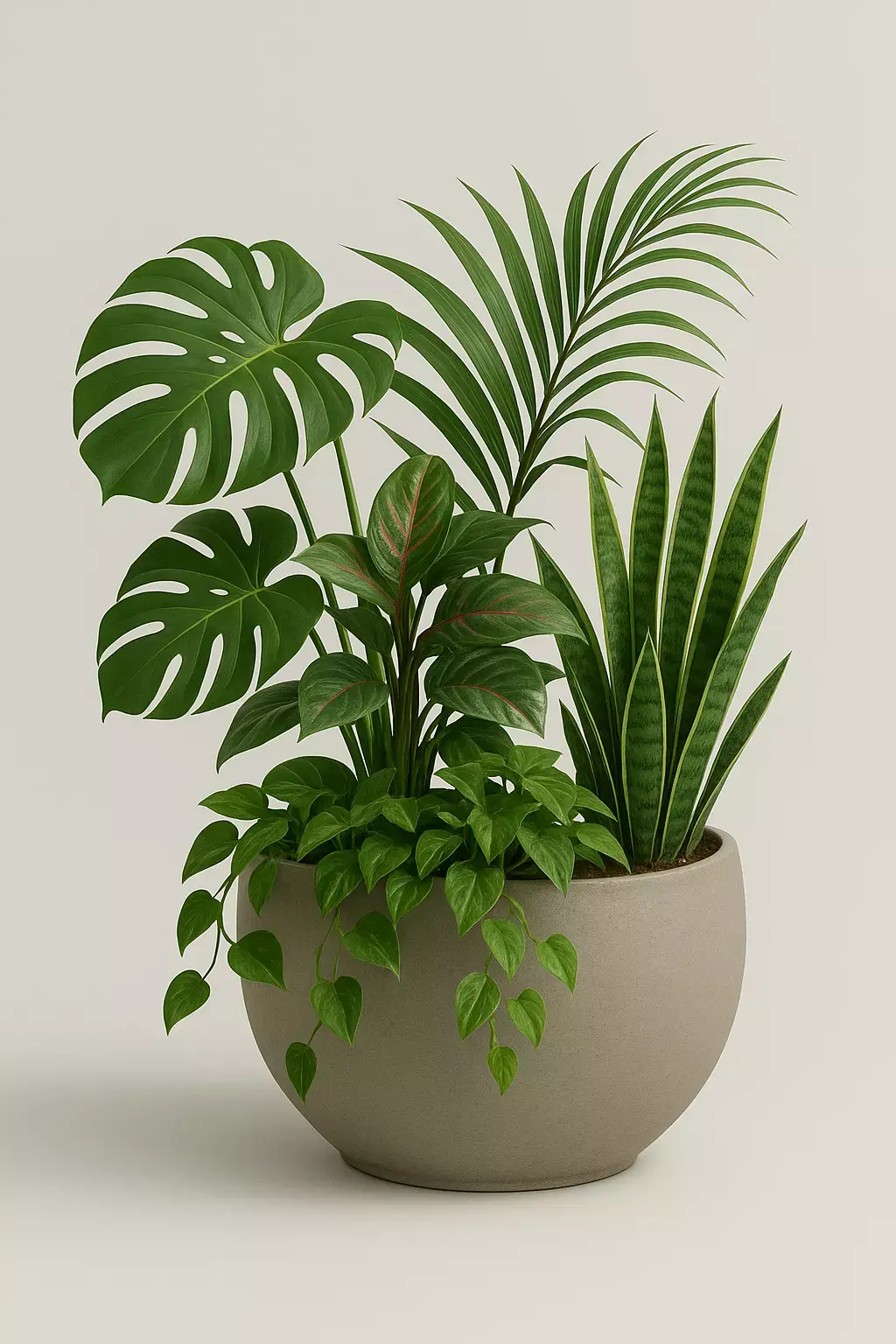 This is a premium, high-detail 3D model of a lush, complex tropical plant arrangement set within a modern, large-format concrete-style bowl planter. This model is ideal for adding immediate, high-impact biophilic realism to high-end architectural visualization (ArchViz) projects, interior renderings, and game environments.