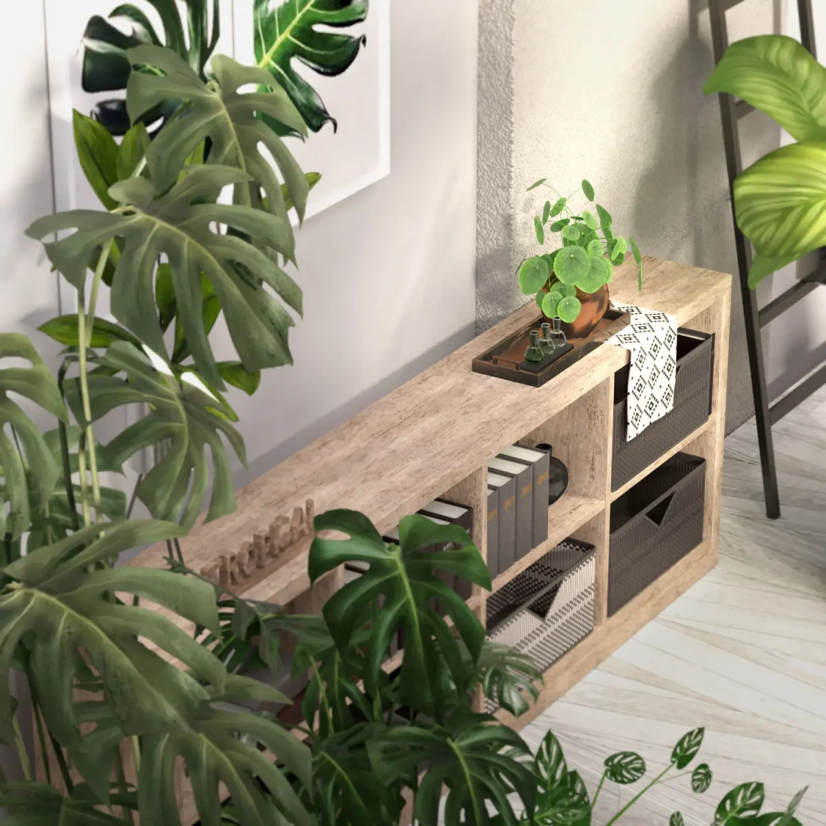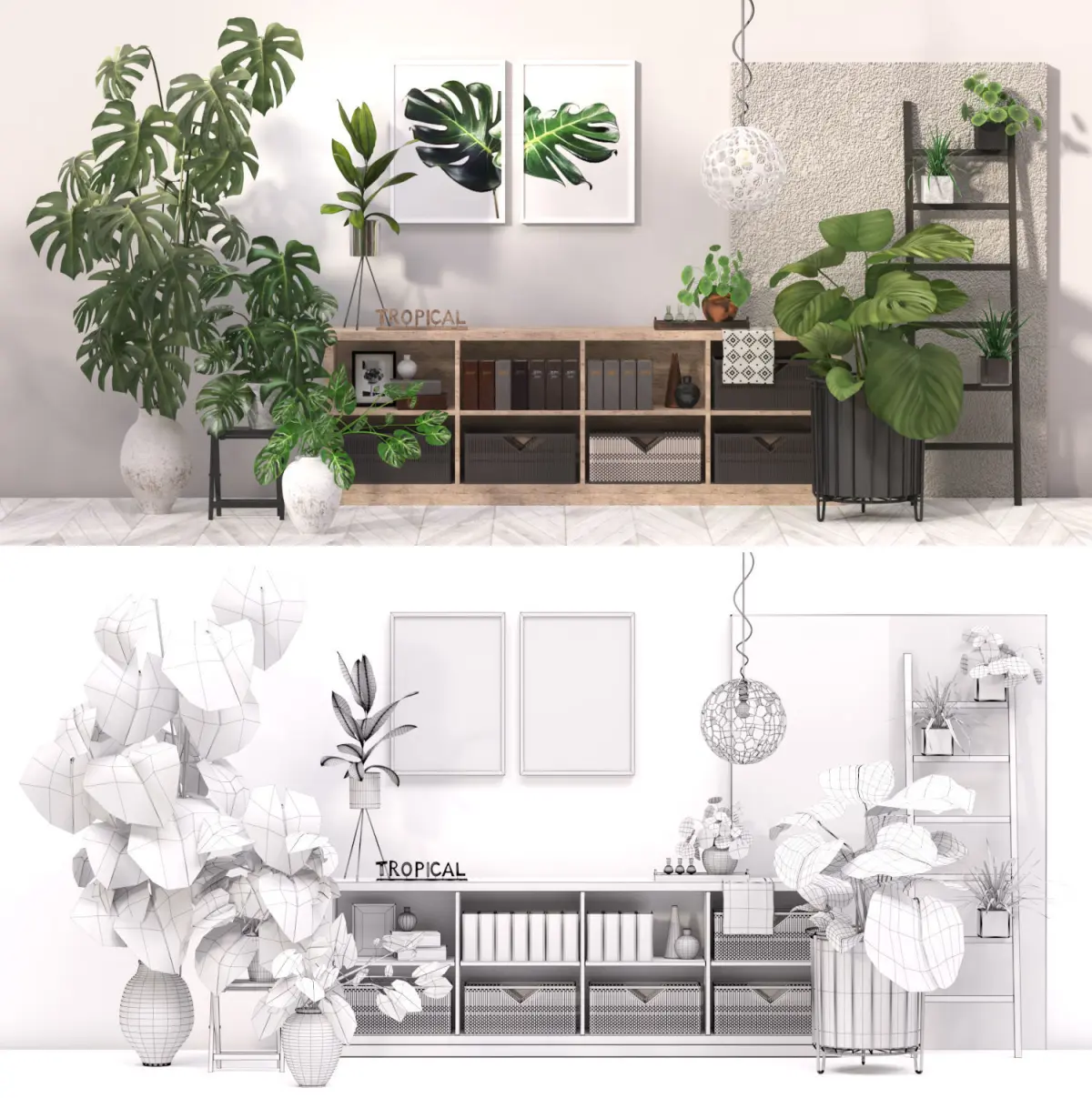 branches tropical monstera pileas peperomias botanical plant leaves vase flowers indoor Calatheas decor collection basket wicker decor set plant tropical tree bush corner decorative decoration tray pot shelf