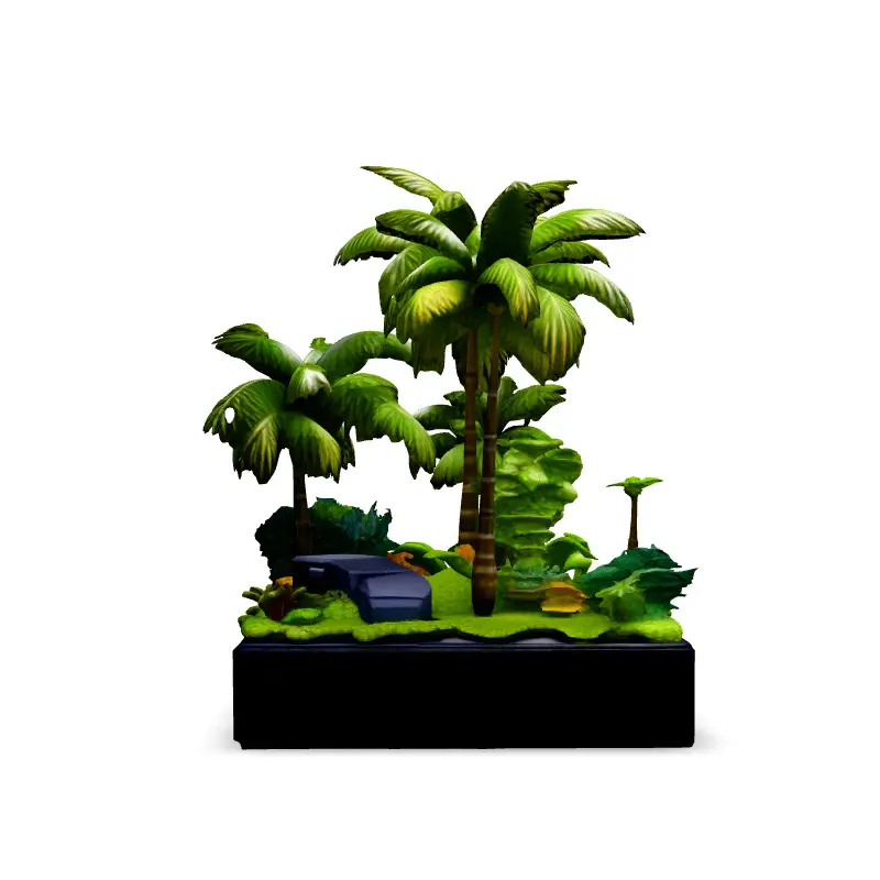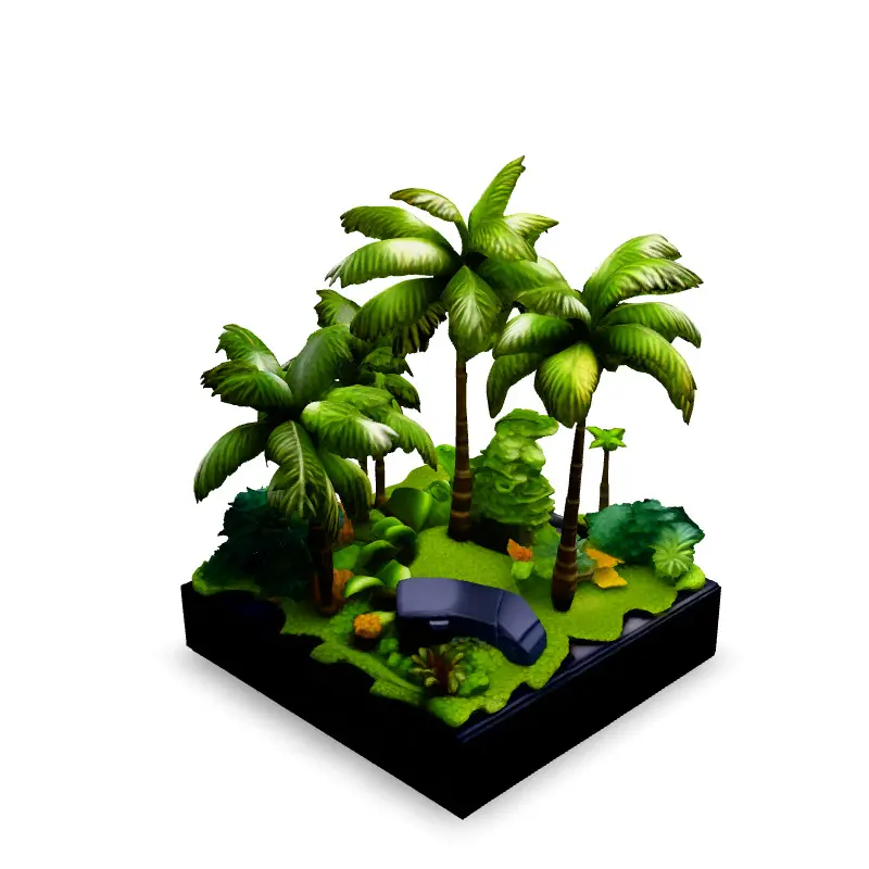 This 3D model presents a stylized tropical island diorama, perfect for game development, especially in creating immersive environments. It can also be used in AR/VR experiences or as a decorative element in architectural visualizations. The model includes various tropical plants, palm trees, and small details like rocks and moss, all set on a square base. Available in FBX, OBJ, and GLB formats, it's optimized for real-time rendering with a low-poly count while maintaining visual appeal. The asset features a clean topology, is UV unwrapped, and comes with PBR textures, making it easy to integrate into your projects. Suitable for both static renders and real-time applications.