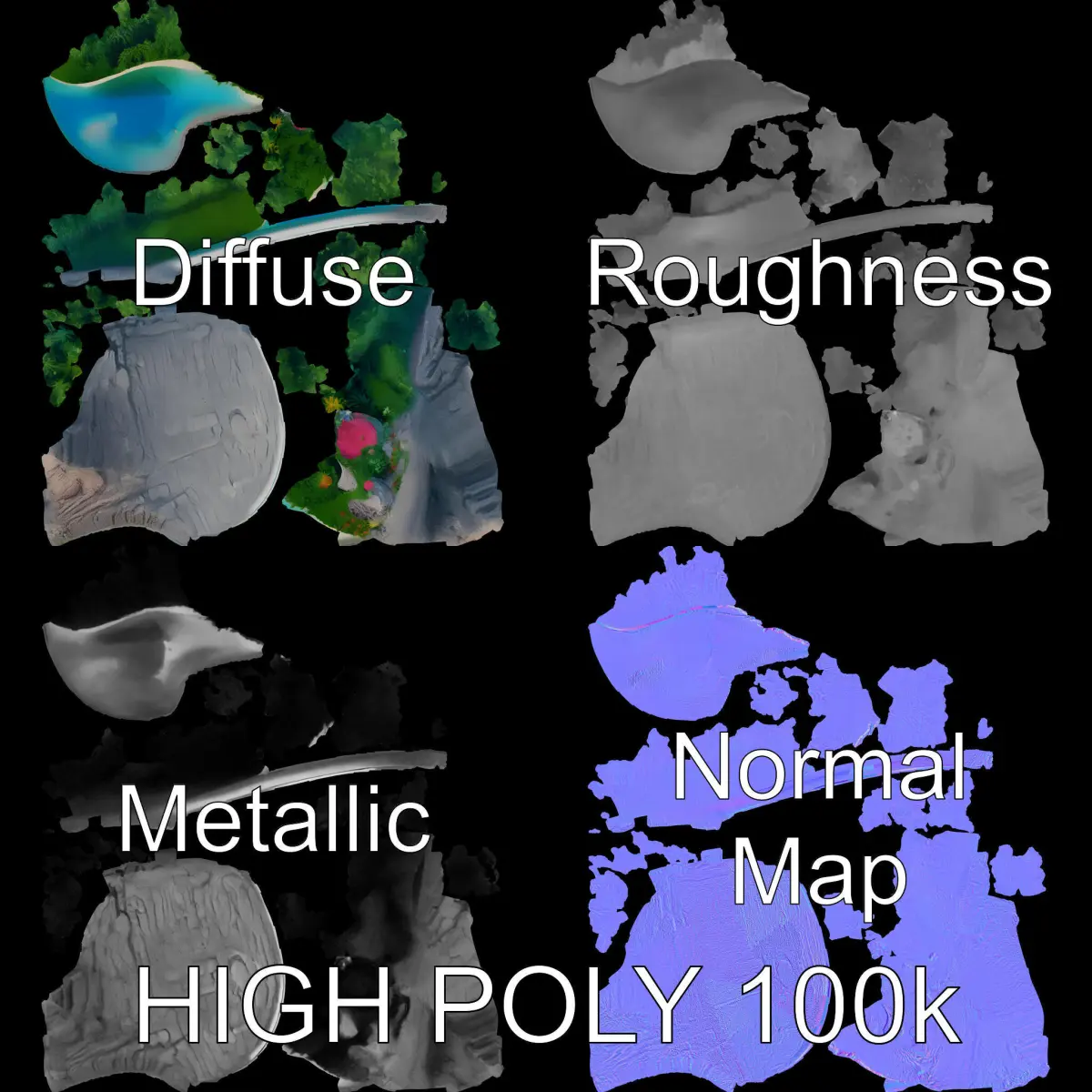 This tropical island scene 3D model pack features stunning landscapes with three levels of detail: low-poly with 1,000 triangles for mobile, middle-poly with 10,000 triangles for environments, and high-poly with 100,000 triangles ideal for production rendering in 3ds Max, Maya, Cinema 4D, Blender, Vray/Corona/Cycles, and more. Perfect for game engines like Unity and Unreal, as well as interactive presentations, this model offers remarkable versatility. The lush greenery, vibrant vegetation, and crystal-clear water make it suitable for creating virtual reality environments, animations, and architectural visualizations. The model boasts 4096x4096 PBR textures, including Diffuse, NormalMap, and reflection/roughness/metallic maps, ensuring compatibility with modern rendering engines. All models are accurately unwrapped with no overlapping UVs. Evaluate the model's quality through preview images showcasing the topology and polygonal mesh. If you like this model, please leave a comment and a like.