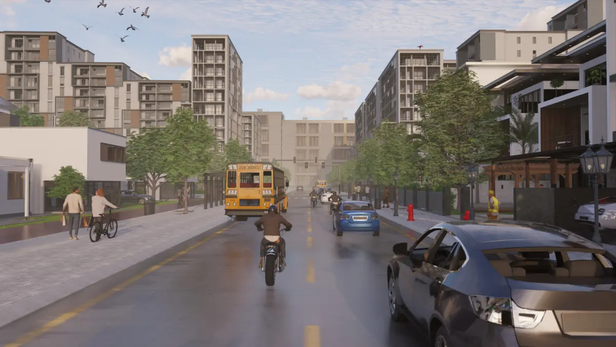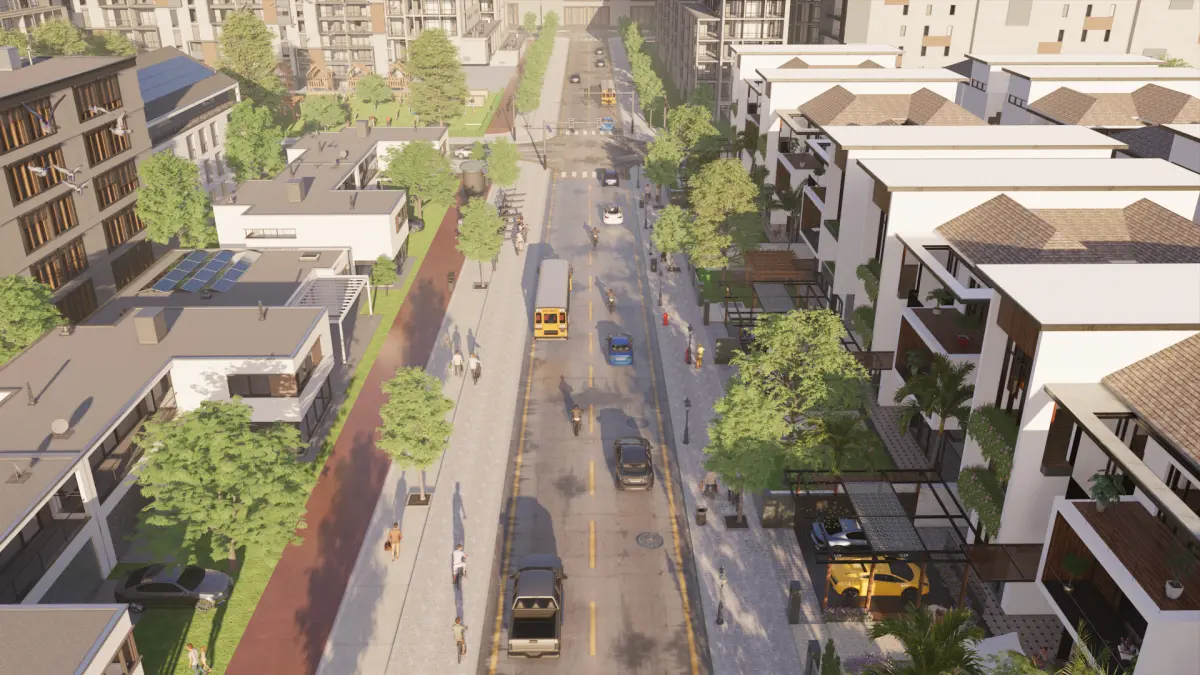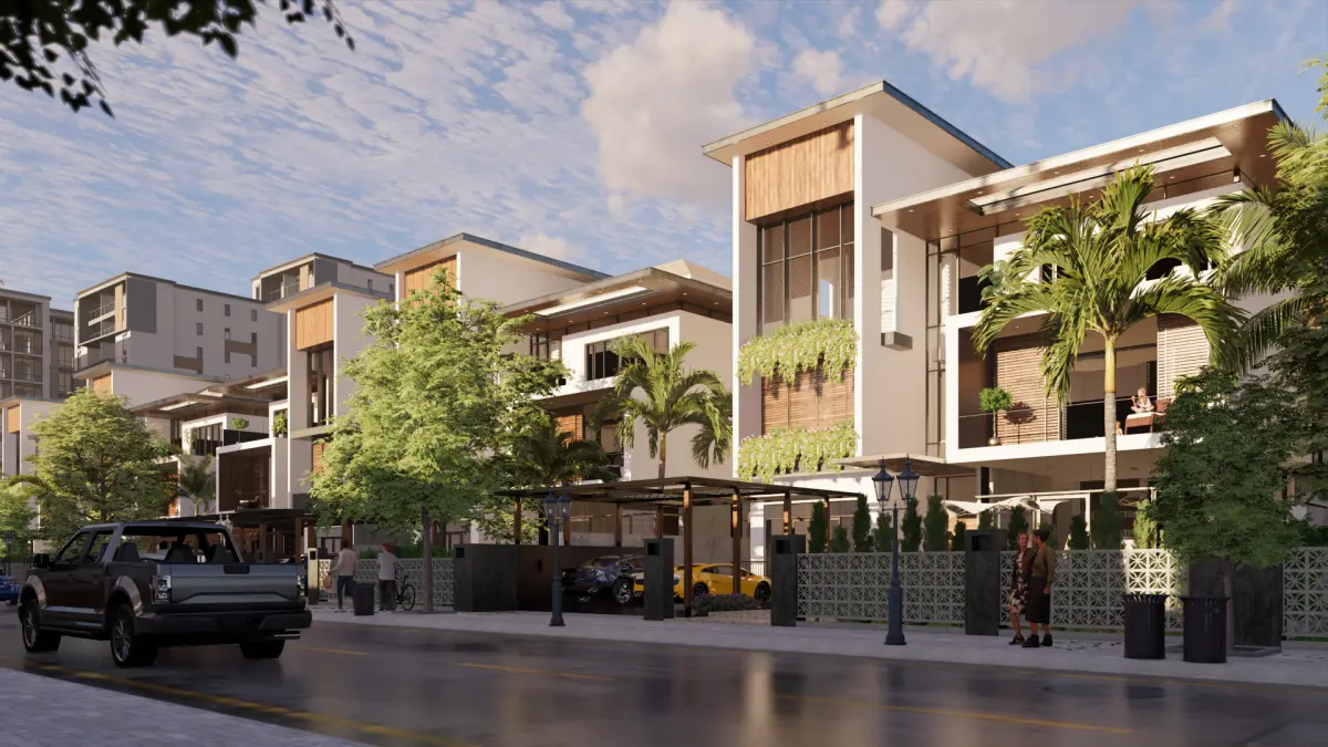 This 3D model presents a modern tropical housing concept designed for upscale urban living. Situated in a thoughtfully planned neighborhood, the design integrates sustainable landscaping, a pedestrian-friendly layout, and a serene urban atmosphere that encourages family life and social interaction.