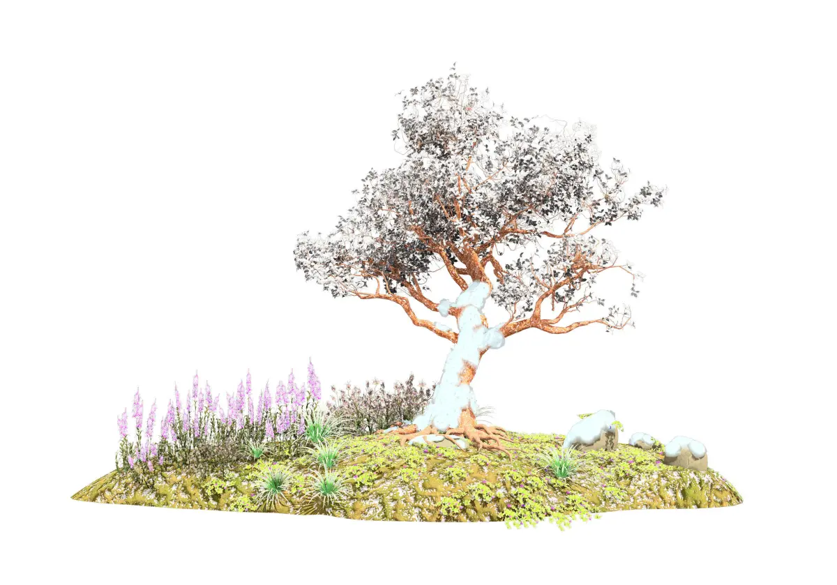This high-quality 3D model of a Royal Poinciana tree is perfect for adding a touch of tropical paradise to your scenes. The model features the trees on a lush green hill covered with flowers, grass, stones, and plants, adding depth and dimension to your creations. In the green version, the tree trunk and stones are adorned with vibrant green moss, while the winter version depicts them blanketed in snow.