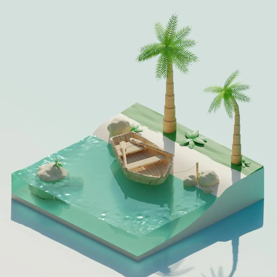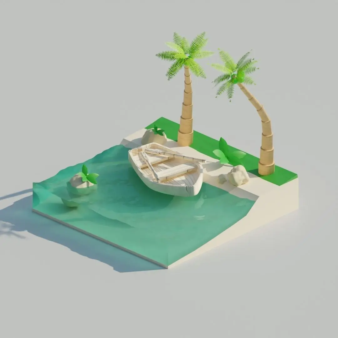 This is a tropical scene in a blender, in the picture there is water with waves + sand + rocks + plants + boat + natural colors , and it's all for $ 2Esho I scored a story about a boat on the catorum there are seats and sticks for throwing