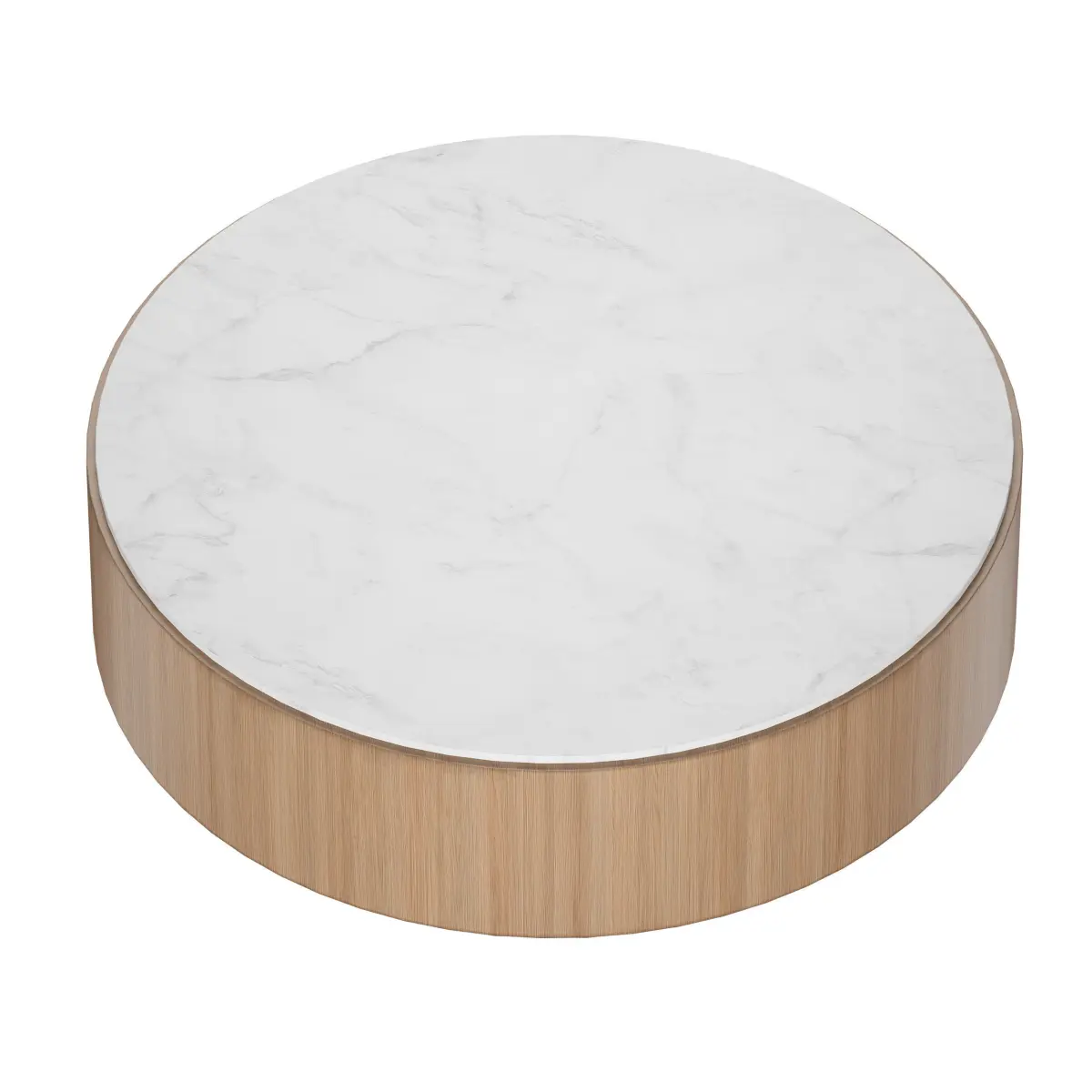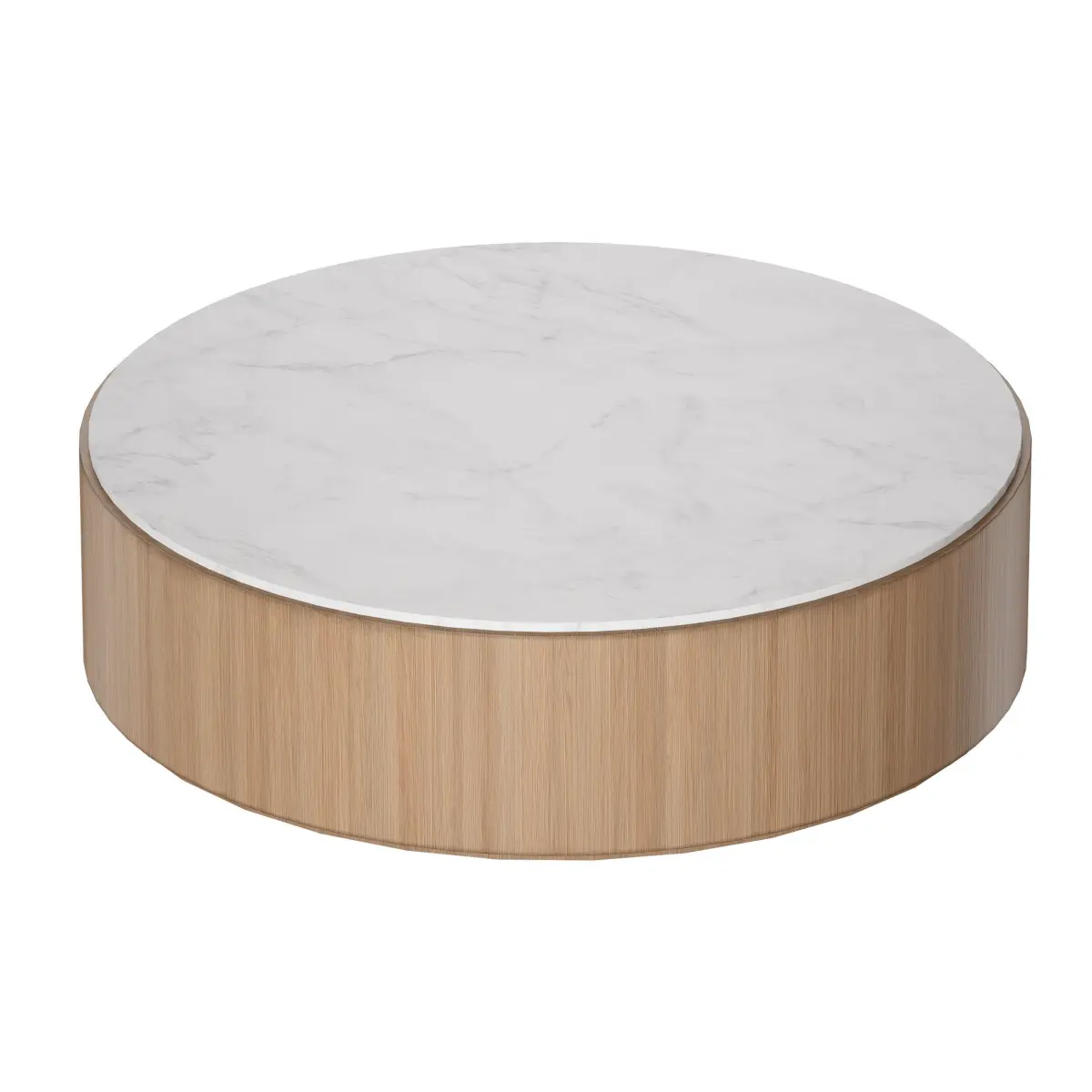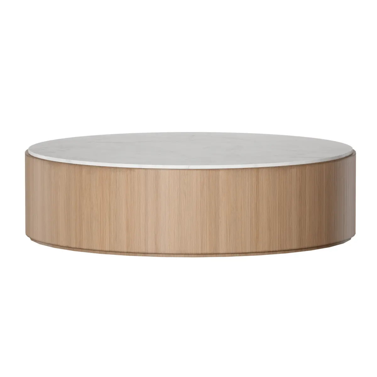 Description from the manufacturer's website:More meets the eye in Troupe's deceptively simple circular design. A continuous bird-beak joint traces the coffee table's perimeter, bringing dimension to its drum-like contours. Composed of quarter-sawn planks of pine veneer, the round table showcases dynamic graining that's enhanced with wirebrushing and an ivory ceruse finish. A top of white Banswara marble pairs naturally with the wood's light, warm color, and a recessed plinth base lets our exclusive coffee table float in a room.