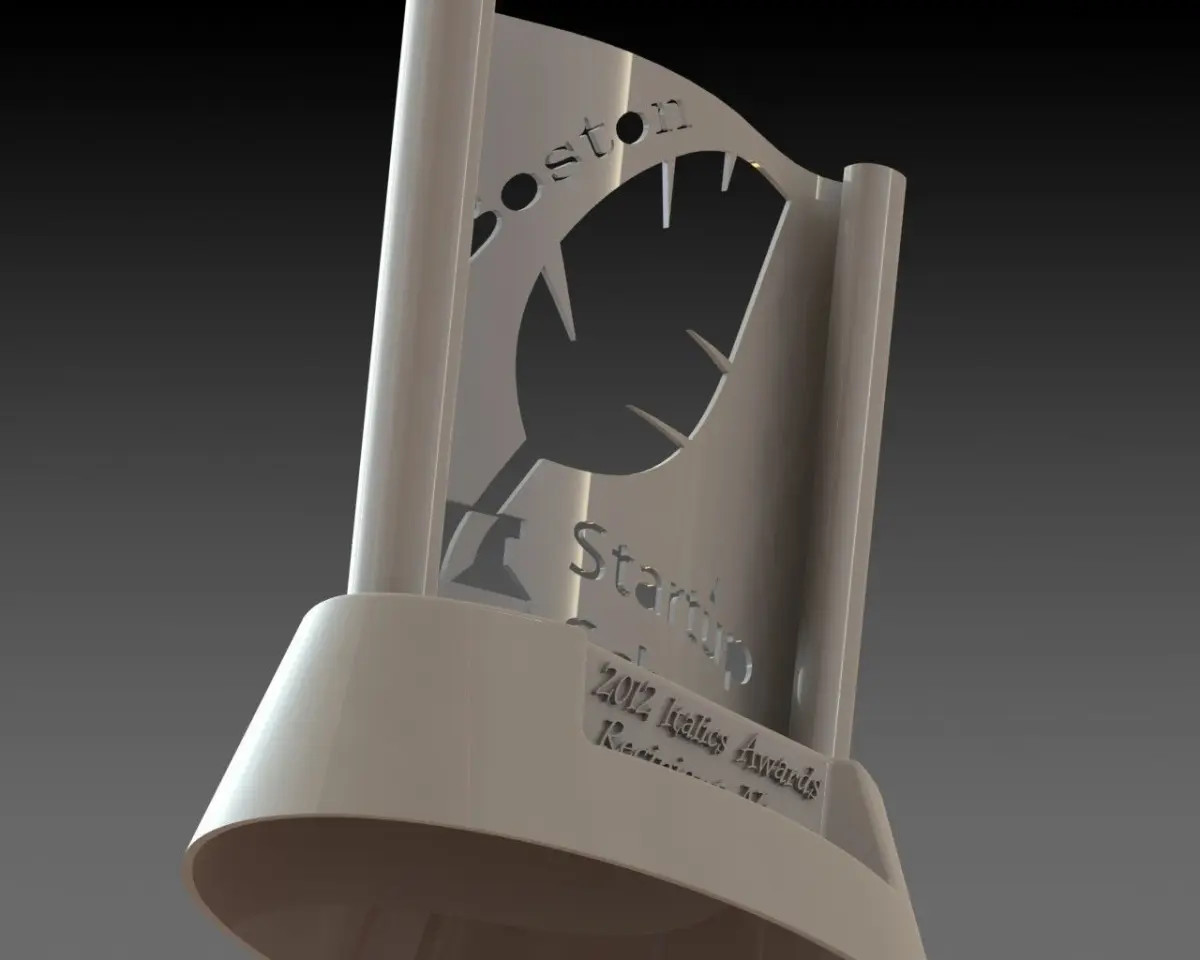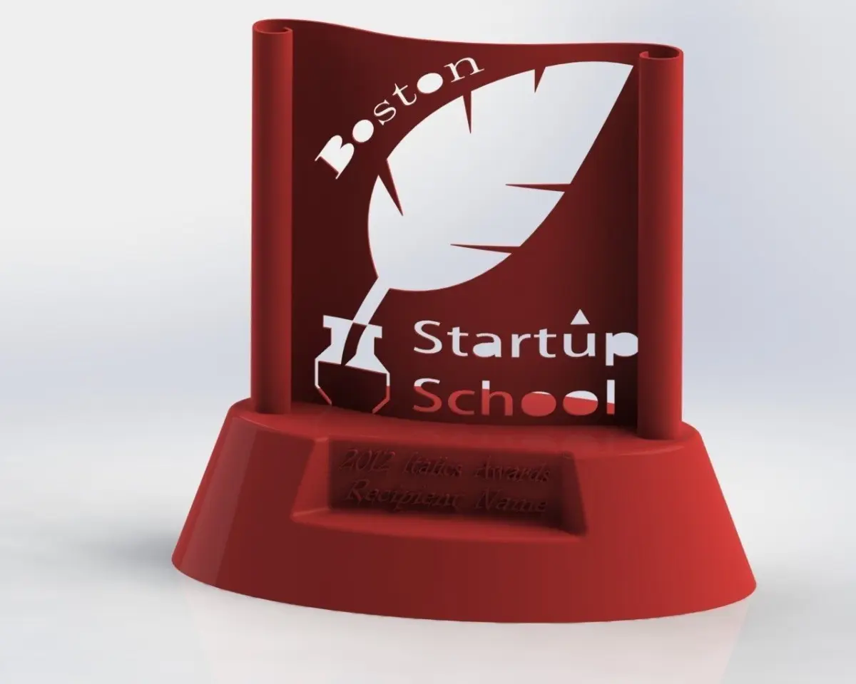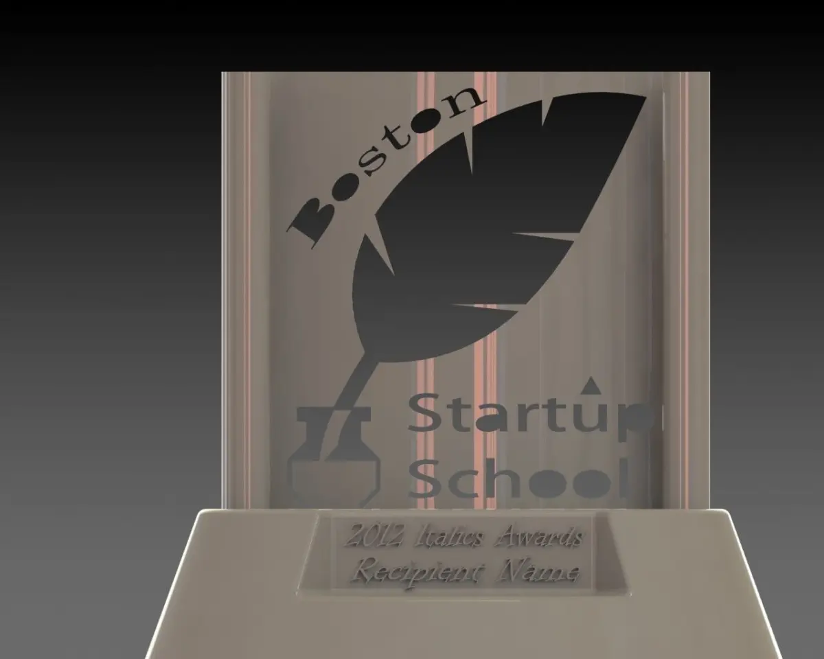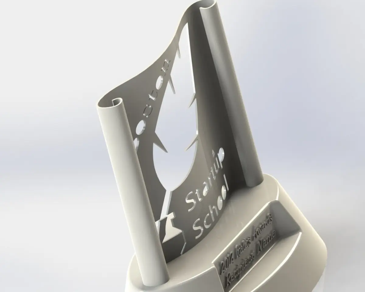 Trophy with a draft in a papyrus, showing the inkwell and quill. It symbolizes the creation of all entrepreneurs, through their ideas embodied through the written word. Due to its geometry, the material consumption to be printed is minimal.