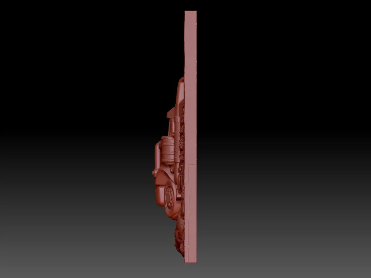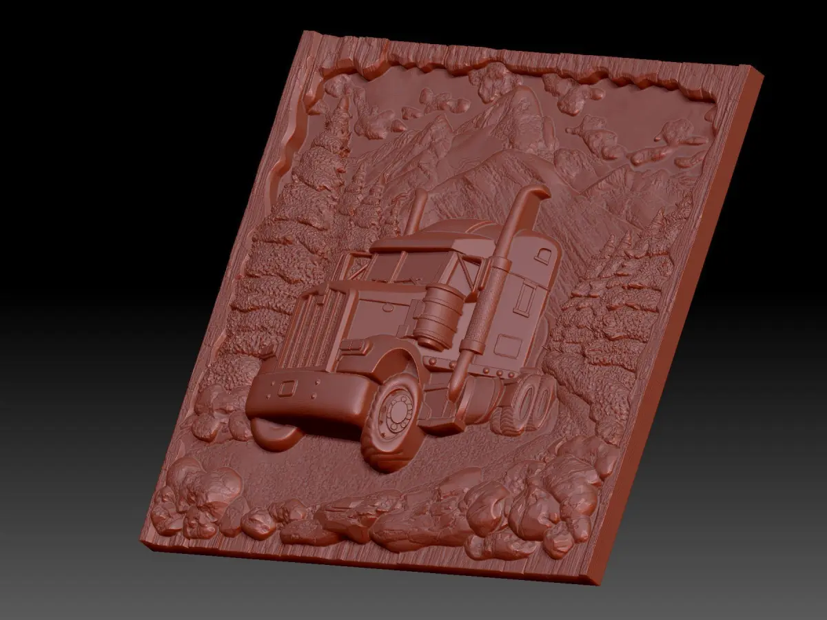 3D model of the bas-relief truck. In the image, the car is moving along a forest road. The project is suitable for 3D printing and CNC machining.