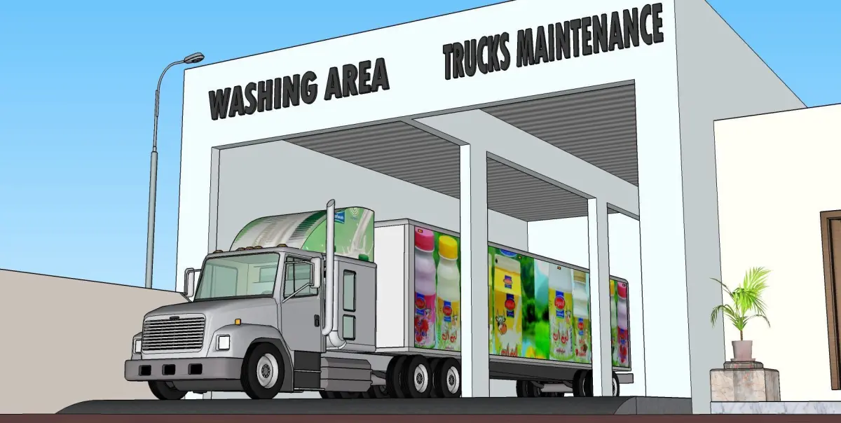 Complete design package for a truck service and maintenance center including reception, offices, truck bays, and a small residential section. Includes AutoCAD DWG, SketchUp model, and rendered elevations. Designed for logistics hubs, rest stops, or fleet facilities.