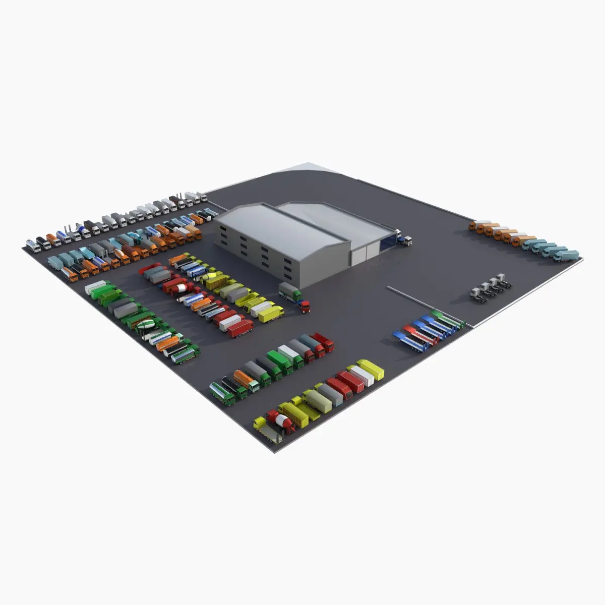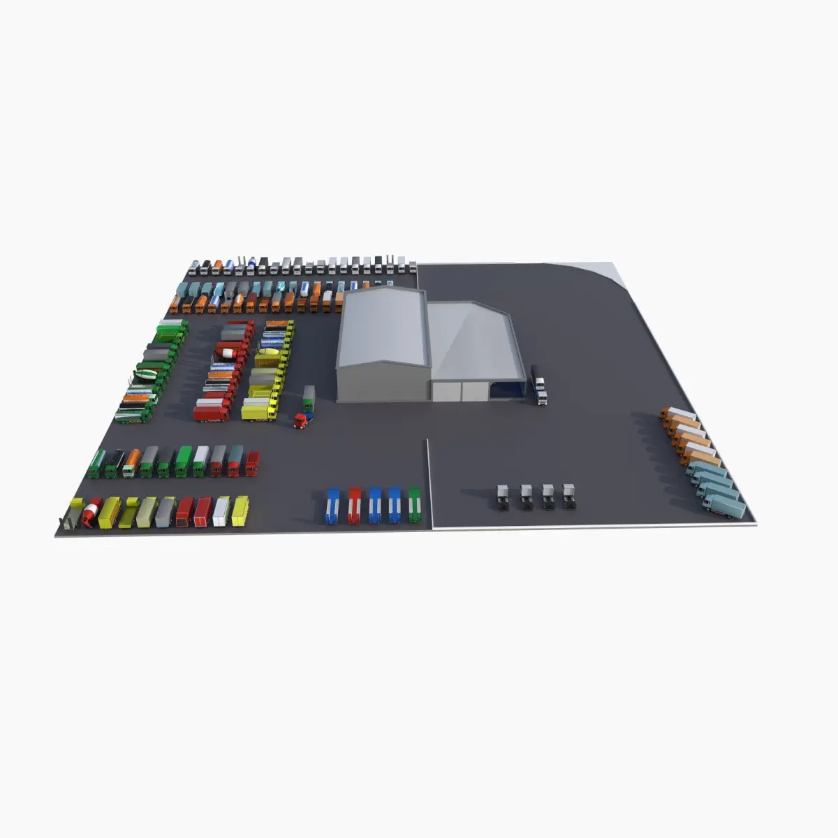 The assembly includes 90 unique models of trucks, trailers and a store building.