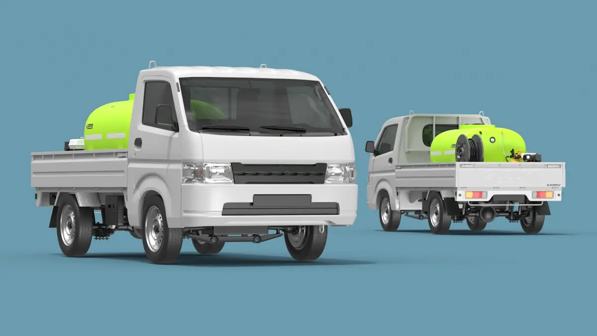 Truck Suzuki Carry with Fire Tank and Pump is a three-dimensional model of fire fight equipment in a modern compact, light commercial vehicle that designed for use in urban environments.