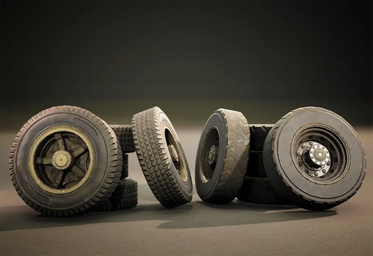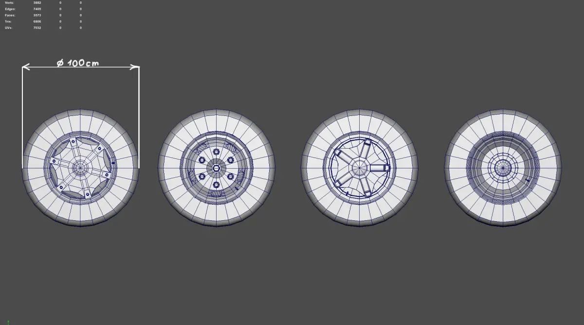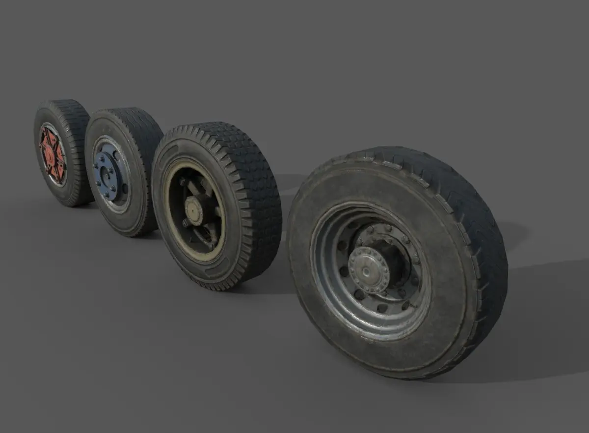 Game model. diameter 100 cm. 6806 triss for all model.2k texture for all wheels (414 px/cm)There are primary baked textures ( Normal, AO, WSN, Curvature, ID, Position) and final textures ( Base Color, Roughness, Normal, Metallic, AO). Maya, obj, fbx. Without LOD's. Non-triangulated meshes. Main renders in UE4.