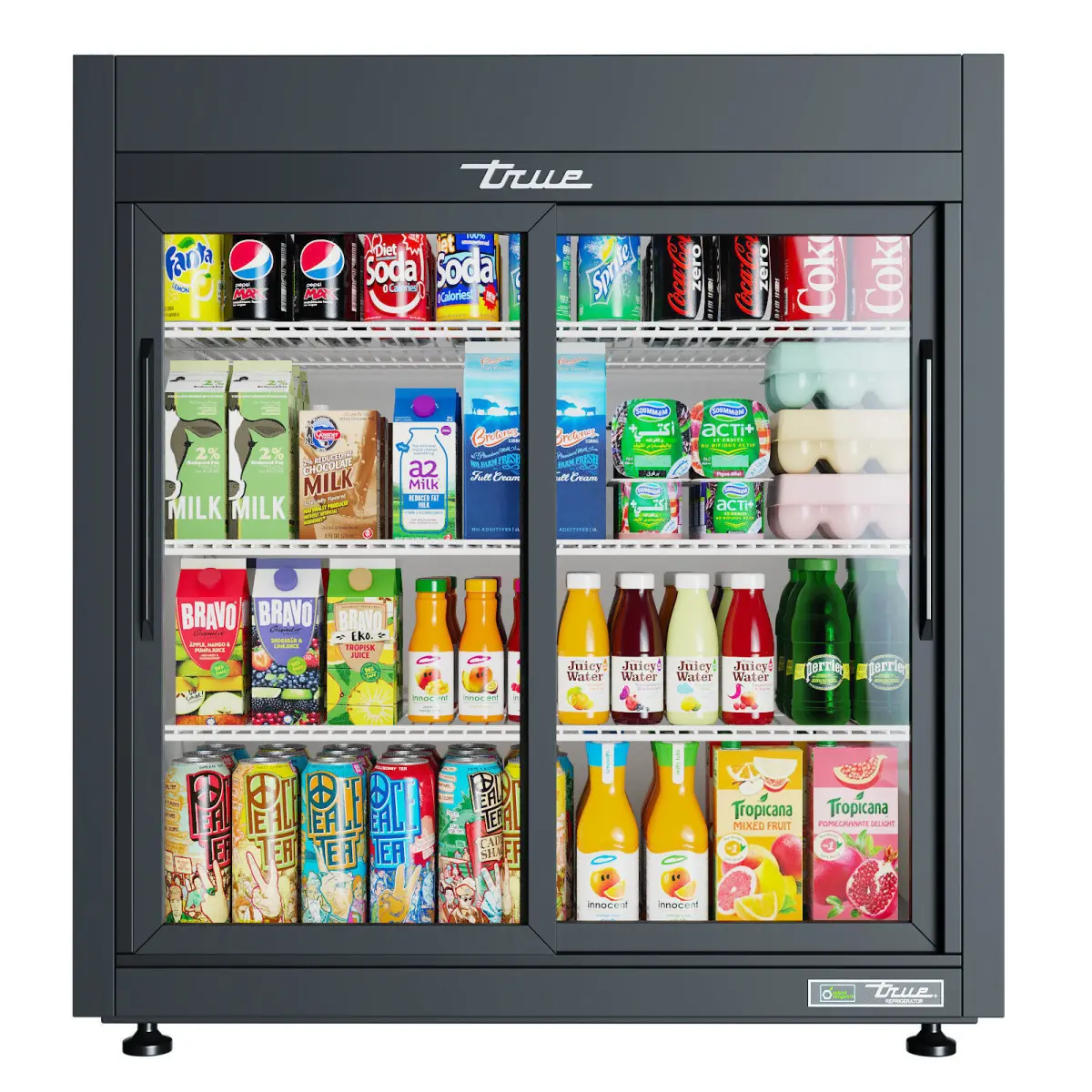 The True GDM-09-SQ-HC-LD countertop display refrigerator has sliding glass doors that provide convenient access to, and showcase, stored items. These doors have 12-inch handles, retaining cold air with their self-closing design. Doors close smoothly with a positive seal to prevent cold air from leaking out. An illuminated exterior sign panel attracts customers to displayed product, and LED lighting shines in the cabinet to increase visibility.