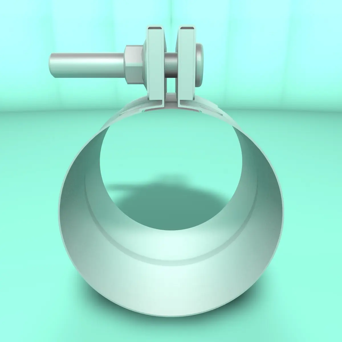 Tube clamp to join two tubes with different diameters. It can be used to attach two pipes, for example, in exhaust systems for trucks, cars, locomotives, stationary machinery and in constructions.Abrazadera de tubo para unir dos tubos con diferentes diámetros. Se puede utilizar para unir dos tuberías, por ejemplo, en sistemas de escape para camiones, automóviles, locomotoras, maquinaria estacionaria y en construcciones.