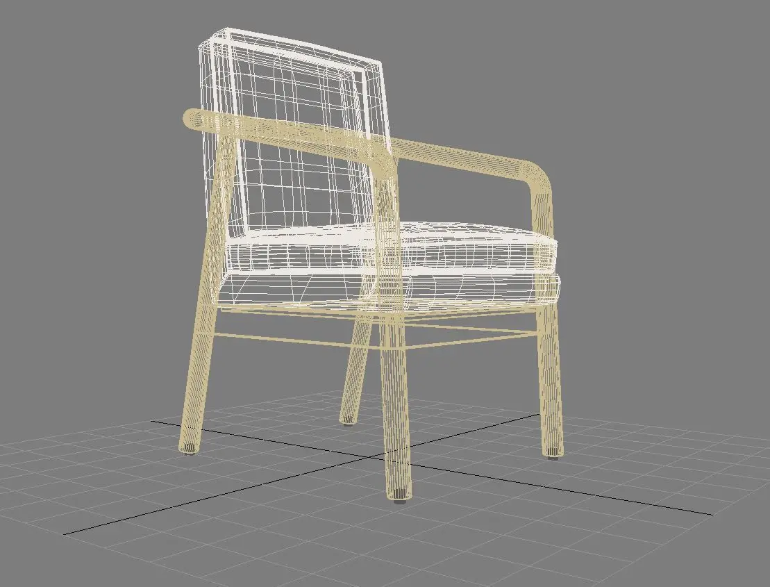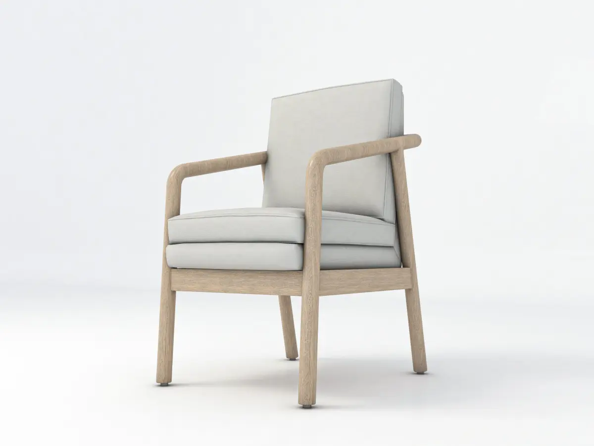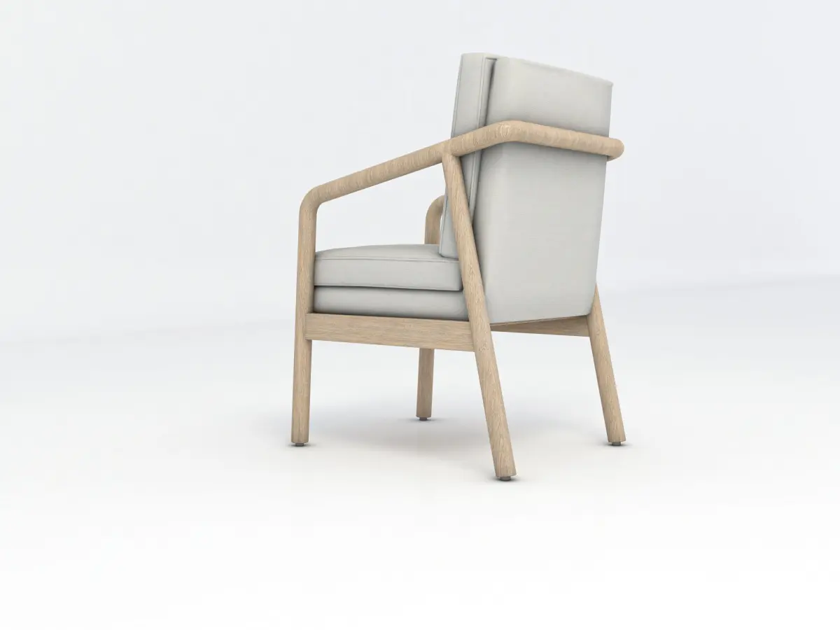 Square beige wooden armchair, Round, angled legs with floor protectors, Double padding along the seat and back and high armrests.
