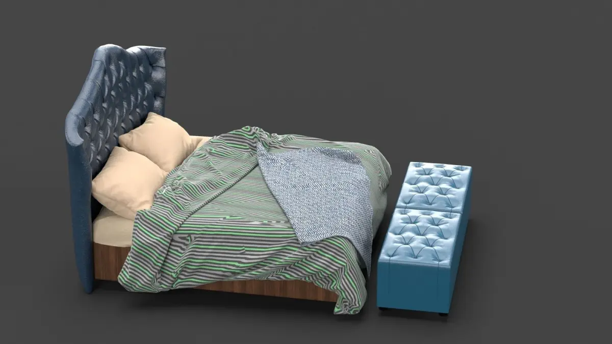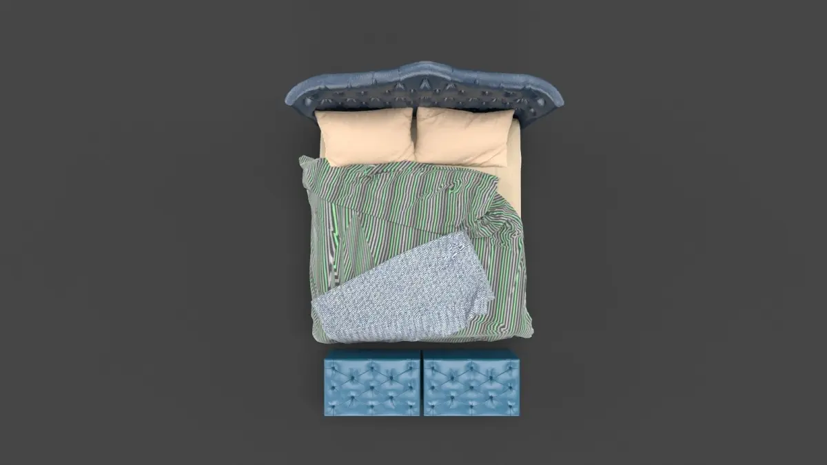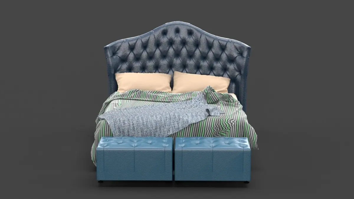A highly detailed model of a luxurious bed. A heightened headboard, with luxurious tufted cushioning and leatheritte upholstery gives a rich and luxurious feeling. can be used in high-end residence designing, and luxurious bedroom designing. Two tufted cushioned bed-ends with leatheritte finish gives an extra luxurious feel. A soft cushion mattress, with highly detailed soft pillows, a spreaded bedsheet and a bed mat. A complete package for all in one.