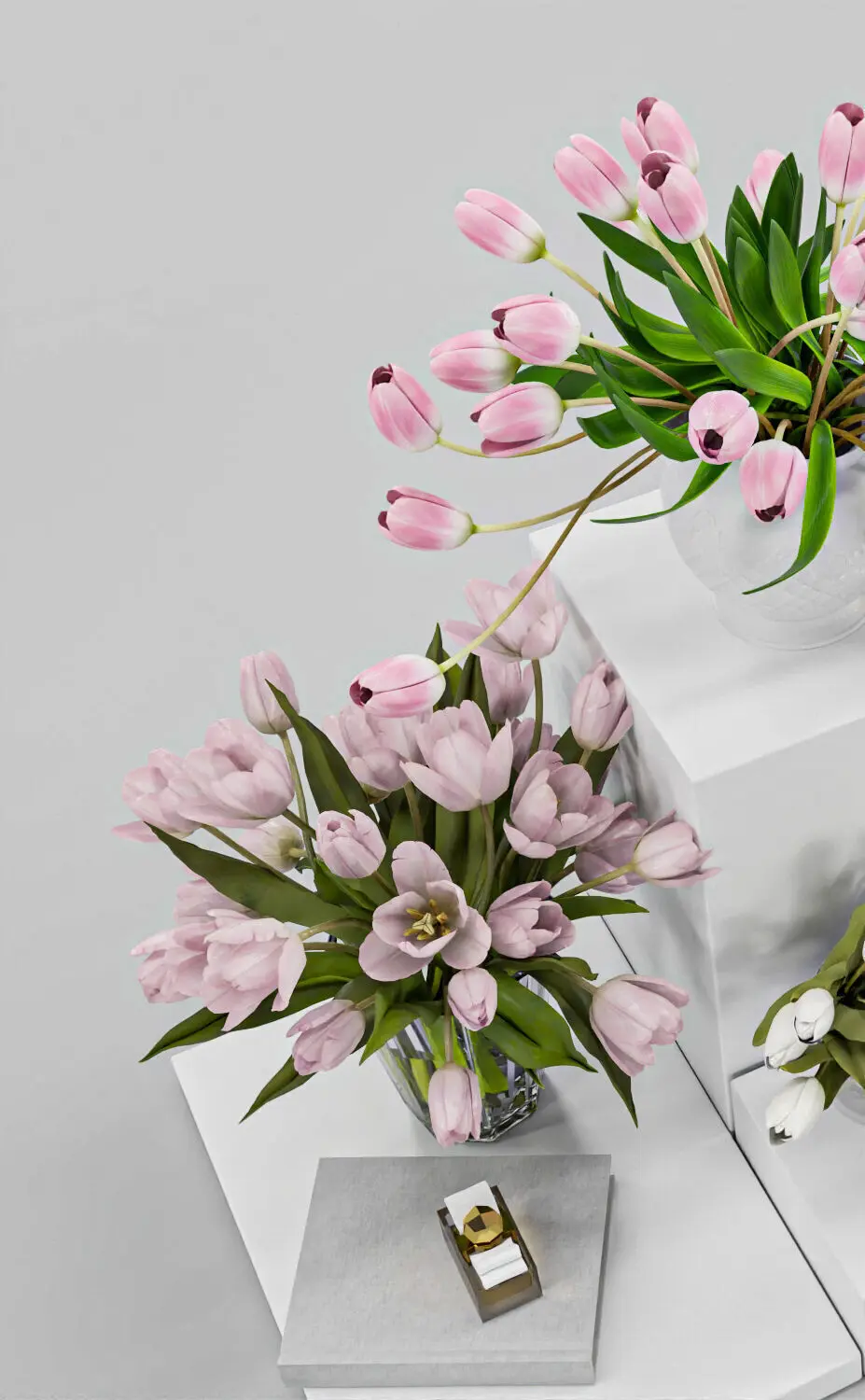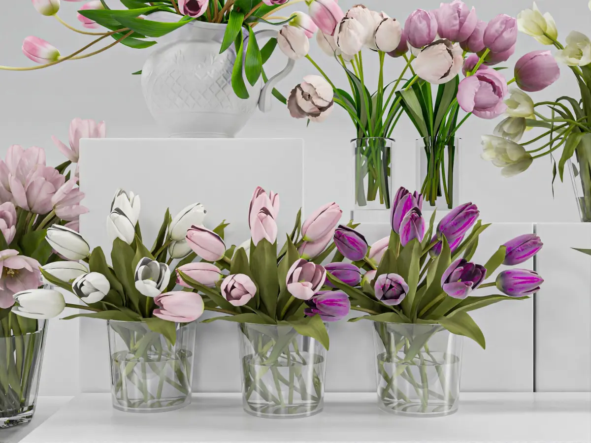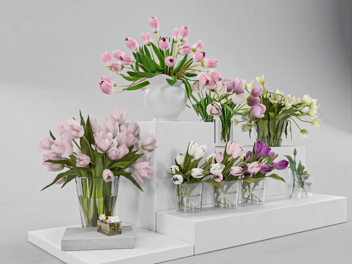 3D model features a highly detailed tulip flower arrangement in a variety of elegant glass vases. It includes different tulip colors—pink, white, purple, and light yellow—perfectly styled in a realistic, modern aesthetic.Ideal for interior visualization, close-up renders, product showcase, and still life scenes.Model Info:– High-quality polygonal model– Clean topology, ready for subdivision– PBR textures included– Optimized for V-Ray renderer– Scene setup with lighting and materials (V-Ray)