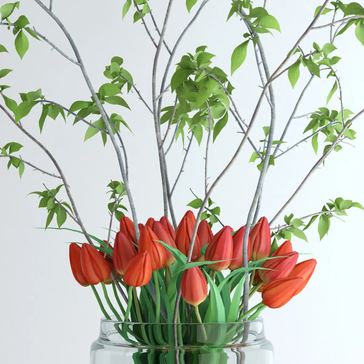File includes a glass jar with very realistic tulips and branches with young spring leaves. Native format is 3dsmax 2014.Model consists of:• 33 red tulips • 8 branches with leaves• Jar with water