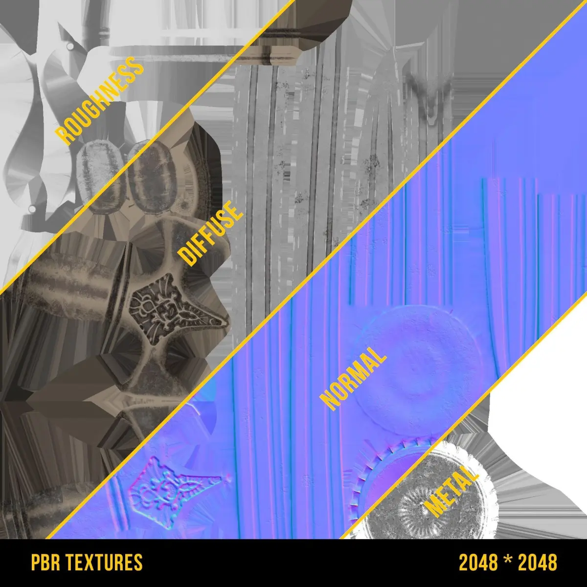 - PBR Materials: Base colour, Roughness, Metal, Normal, Occlusion