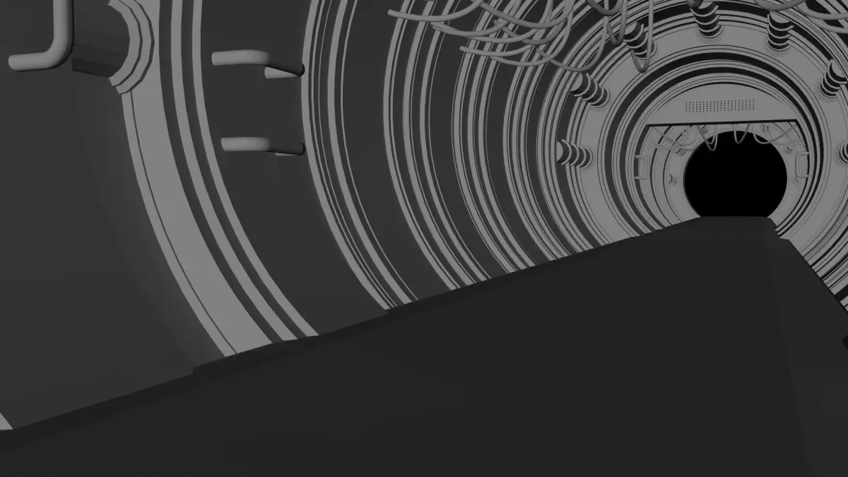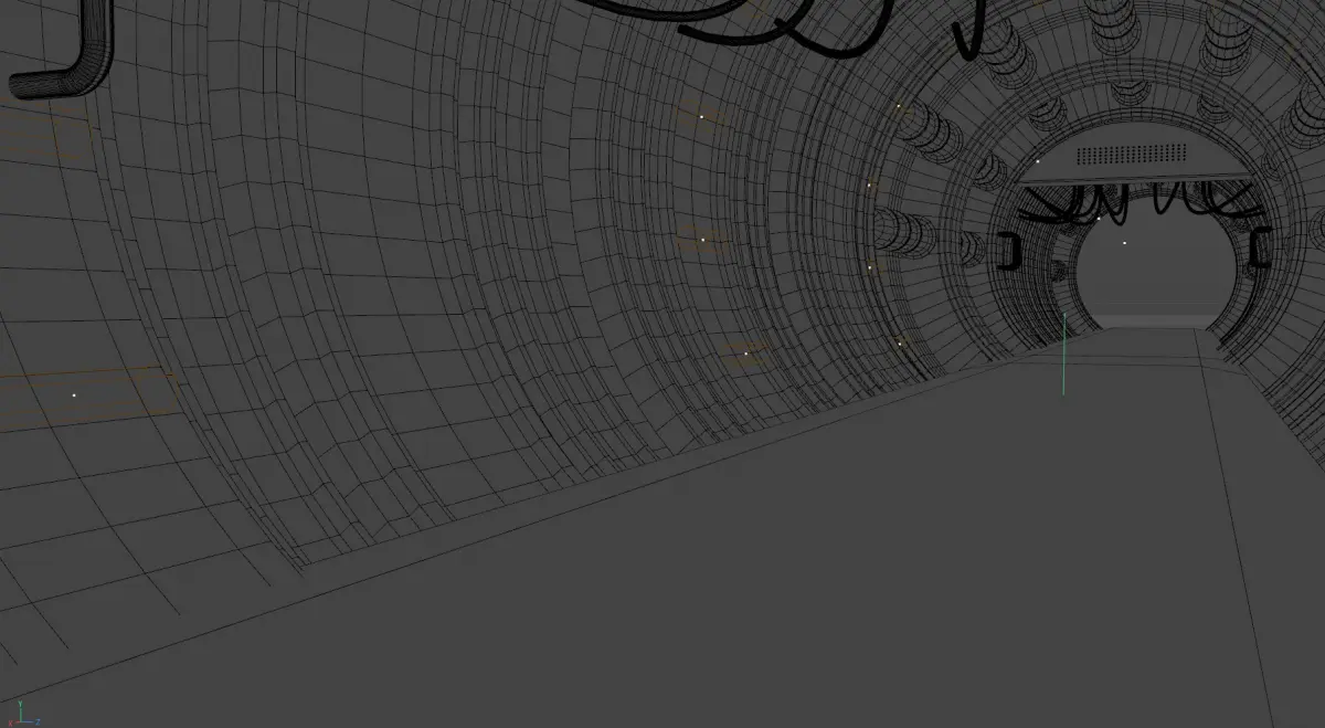 The image depicts a futuristic, industrial tunnel with a sleek and metallic design. The tunnel walls are layered with segmented rings, giving a high-tech, sci-fi appearance. Warm, ambient yellow-orange lighting lines the inner walls, casting a subtle glow along the pathway. The floor consists of textured, dark metal panels with a grid-like pattern, adding to the industrial aesthetic. At the far end, the tunnel leads into darkness, creating a sense of mystery and depth. Thick cables and mechanical components are visible, suggesting that this could be part of a spaceship, research facility, or advanced underground installation.
