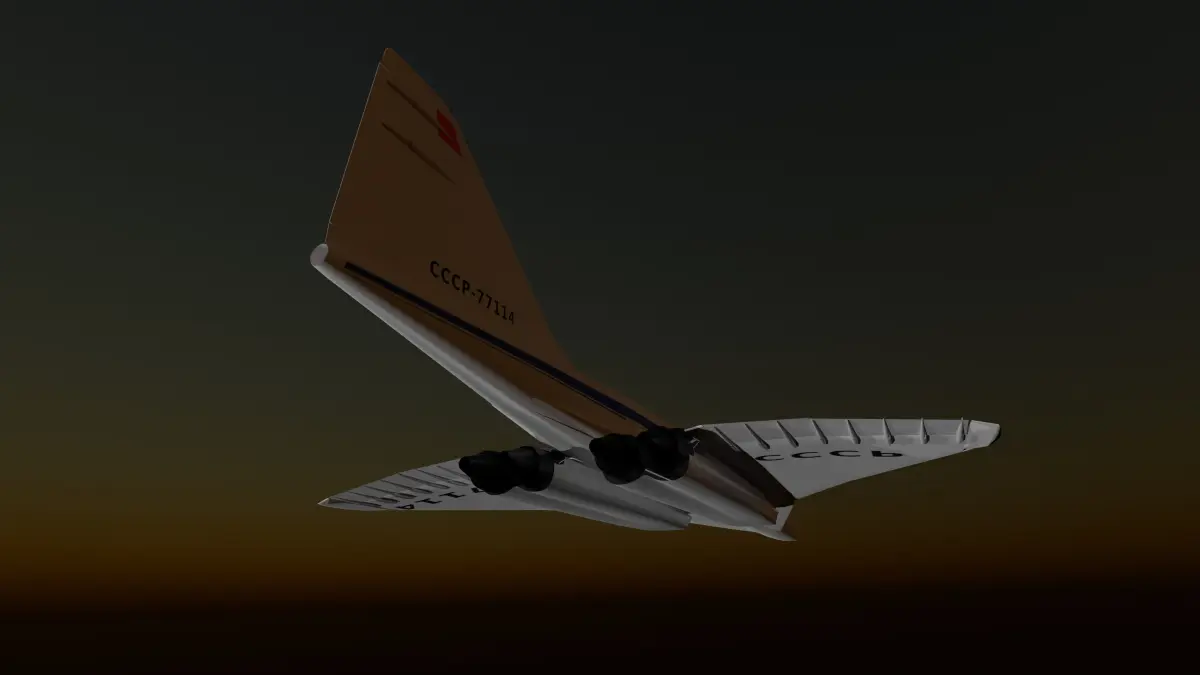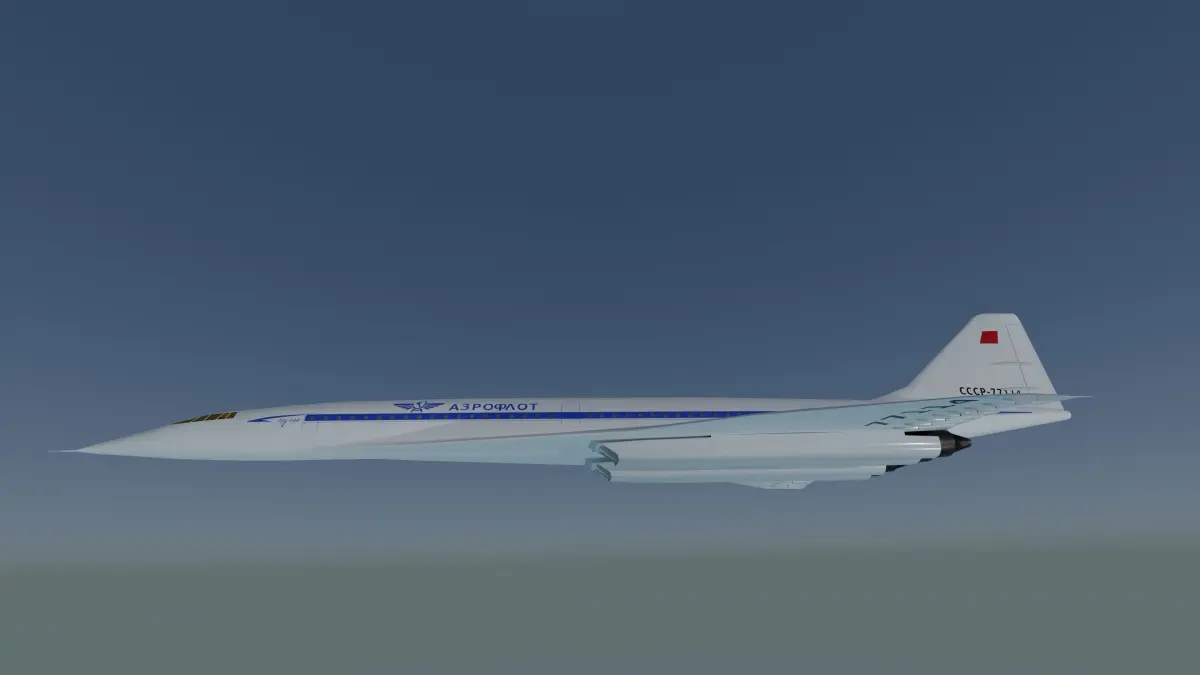 Modell of the russian counterpart of the Concorde. A Supersonic Airliner. Mande also with help of fotos of an original at Sinsheim Technick Museum. The control surfaces are separate objects and riggeable. The decals are made by myselve in pretty high resolution by Gimp.