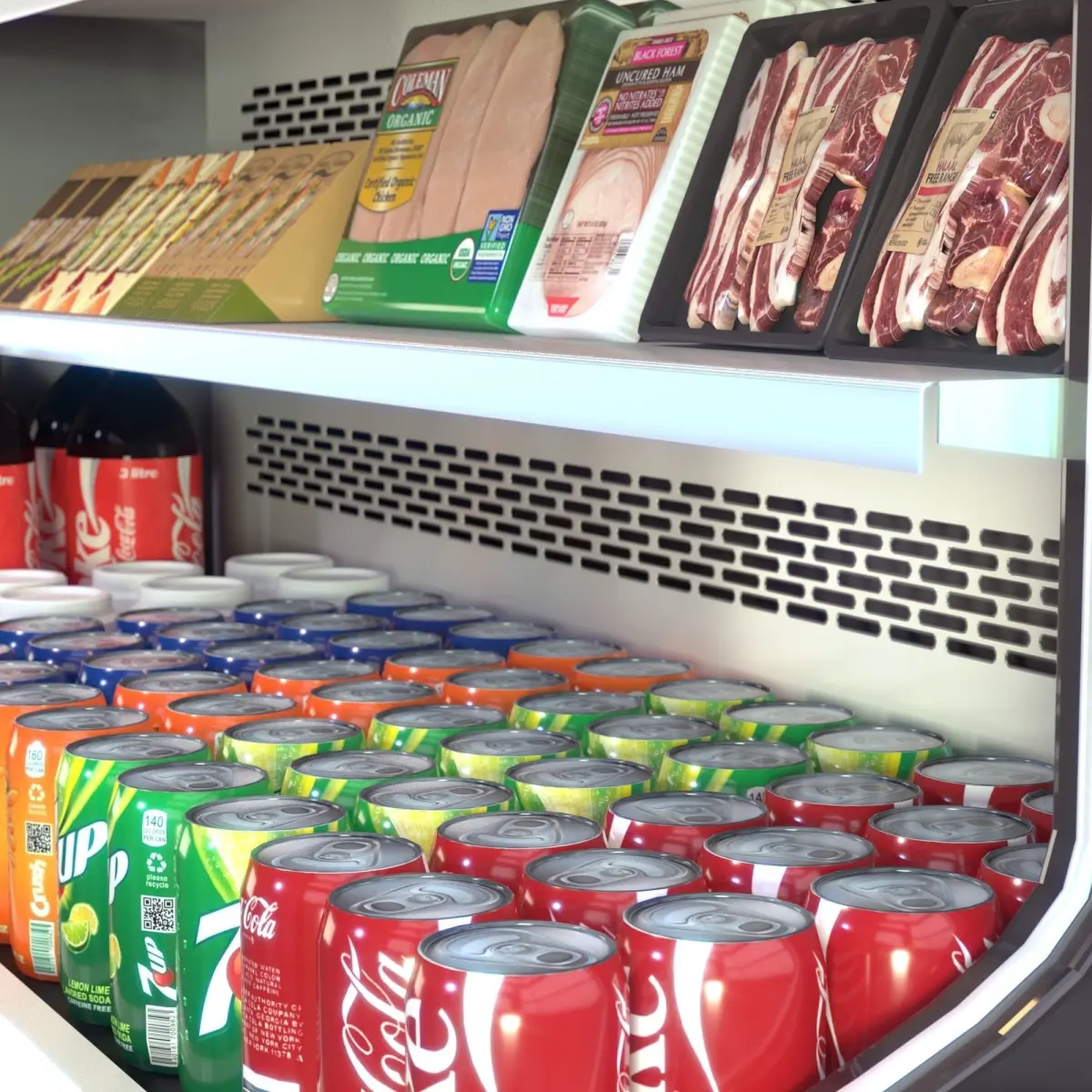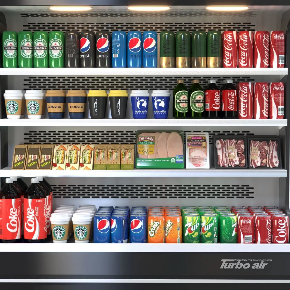 the turbo-air Commercial Refrigerator includes 23 brands of:soda, drink, meet, Bologna, coffee, sandwich