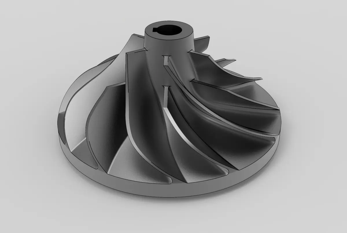 Turbo impeller. Dimensions: Diametr- 152mm Height - 75mm. It's Solidworks model was exported in other CAD formats:(X_T, IGES, STEP, OBJ, SAT and STL). This 3D model can used in producing on CNC machines and for 3D printing.
