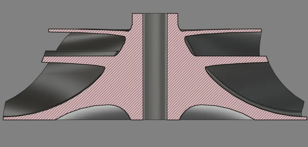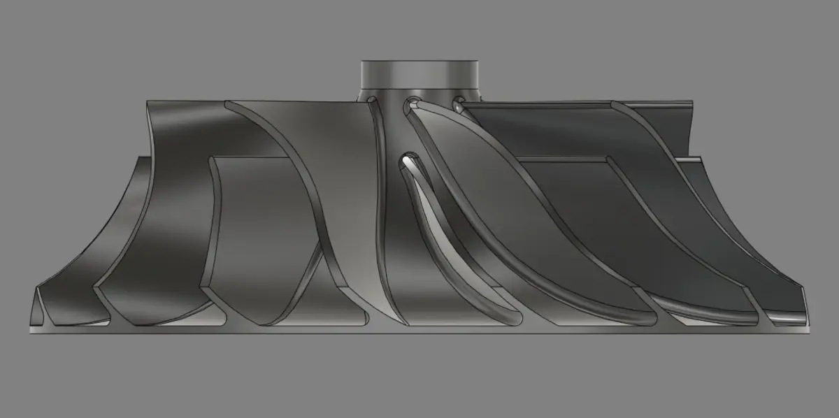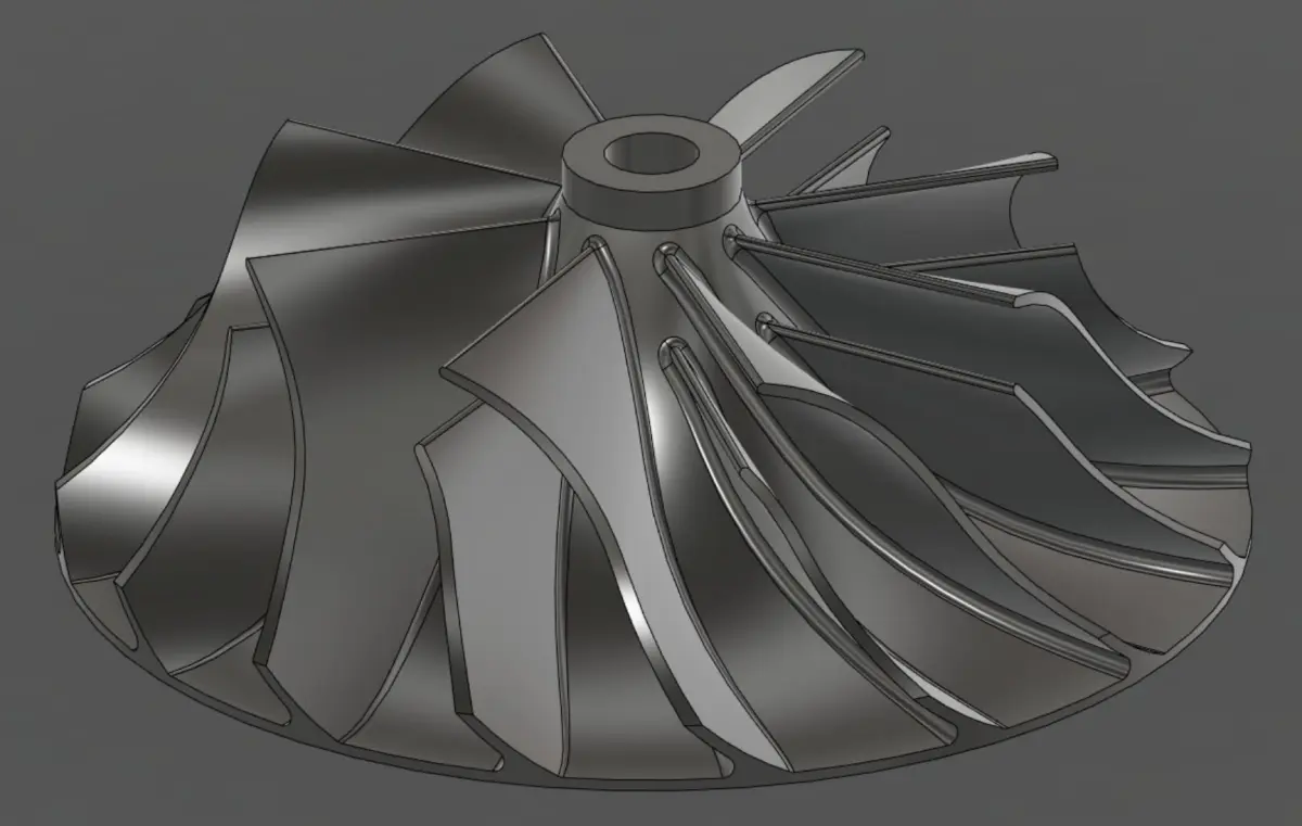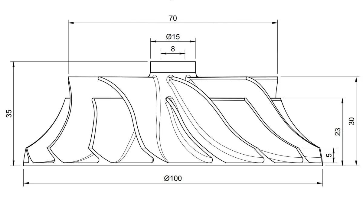 Turbocharger Impeller, with with efficient geometry. With two rows of blades.Diameter 100mmInlet diameter 70mmShaft diameter 8mmBlade thickness - 1.4mm at the base and 1mm at the edgesOther sizes in photo 5