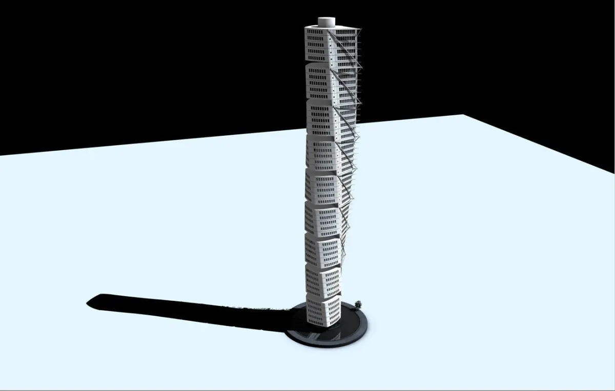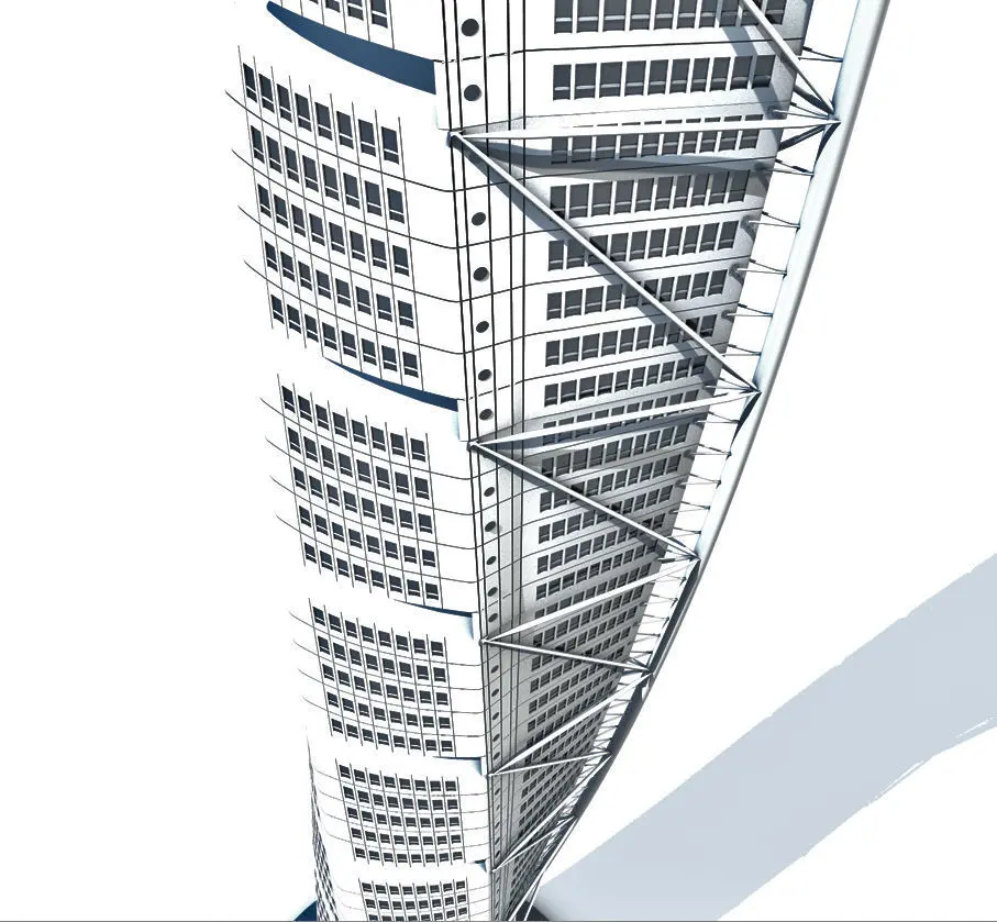 This is an accurate depiction of the Santiago Calatrava Building the Turning Torso.It's the only model I have seen that not only has an accurate window count, but the base, entrance and grounds are all modeled.If you get the C4D or FBX version, they include day and night versions that are rigged and accessible by simply activating one and deactivating the other.The 3Ds version does not include the night version however.(The file size was going to be huge, so that didn't work out. 3Ds still has the same beautiful model, just no night rigging)