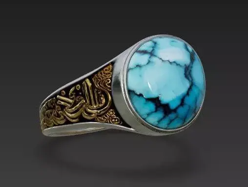 Natural Turquoise Cabochon The crown of the ring is a smooth, domed turquoise stone (Firoza). It isn't a perfect, solid blue; it features realistic black veining (the matrix) running through it. This detail proves it is a natural stone rather than plastic, adding value and realism to the asset.