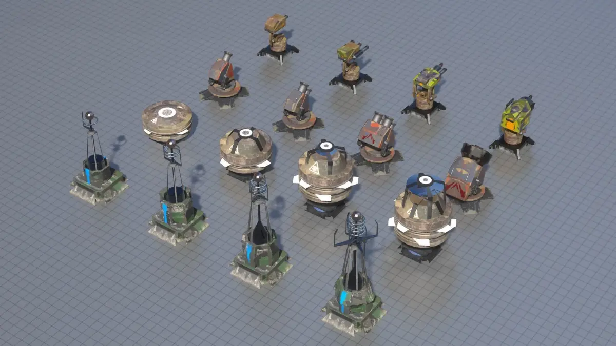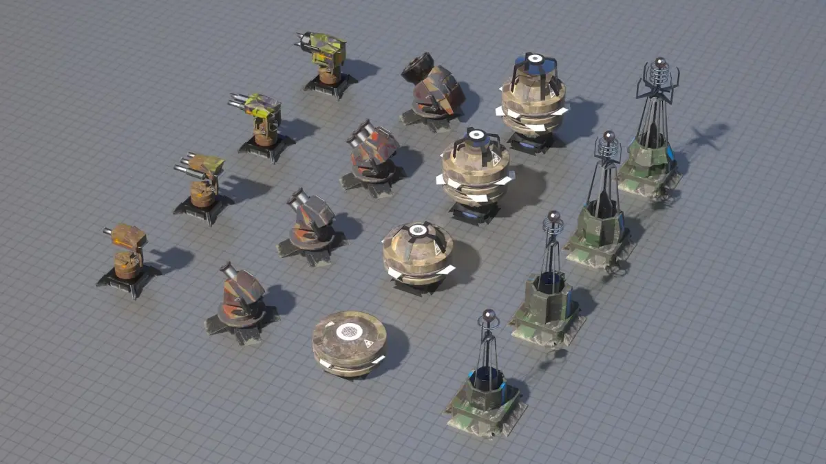 - 16 different models of low poly turrets