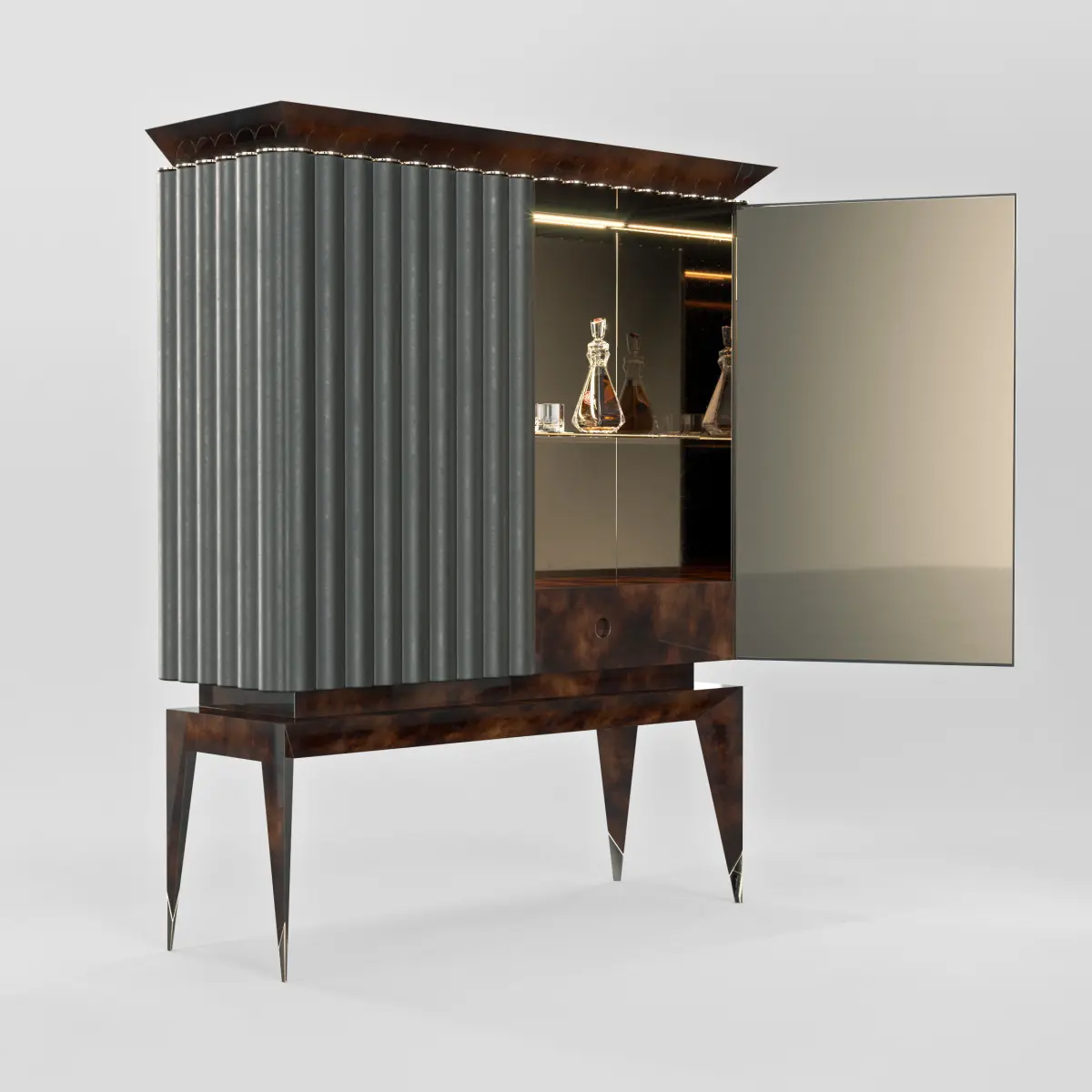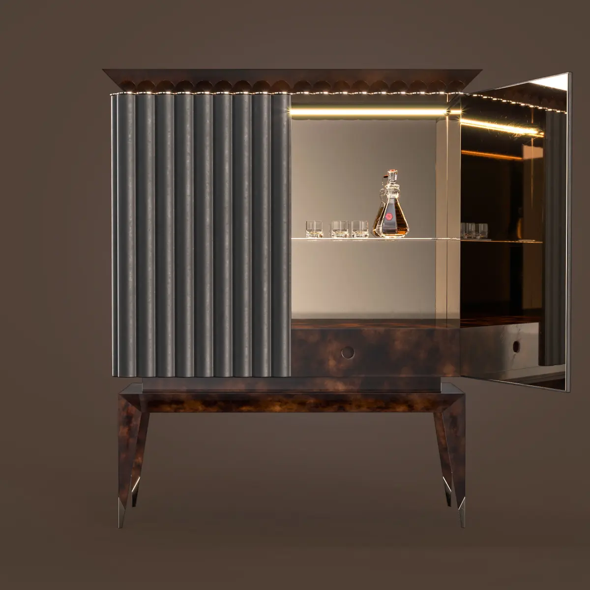 Turri Orion 2-door bar unit.realworld size: 142.5x50x173hlowpoly base with turbosmooth applied to detailed objecs.whiskey bottle is design of my own, it's not represnting any brand.