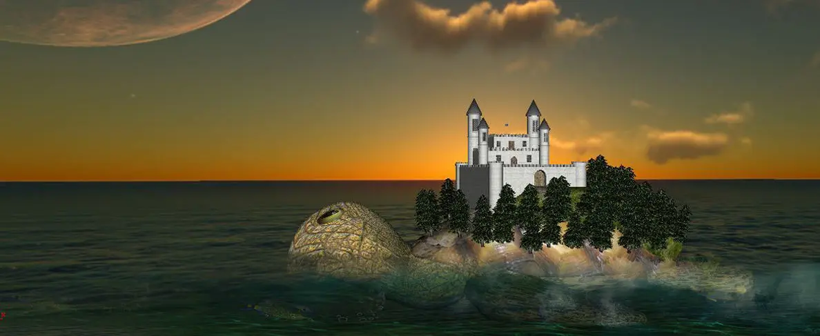A model of turtle with a castle on his back with trees.