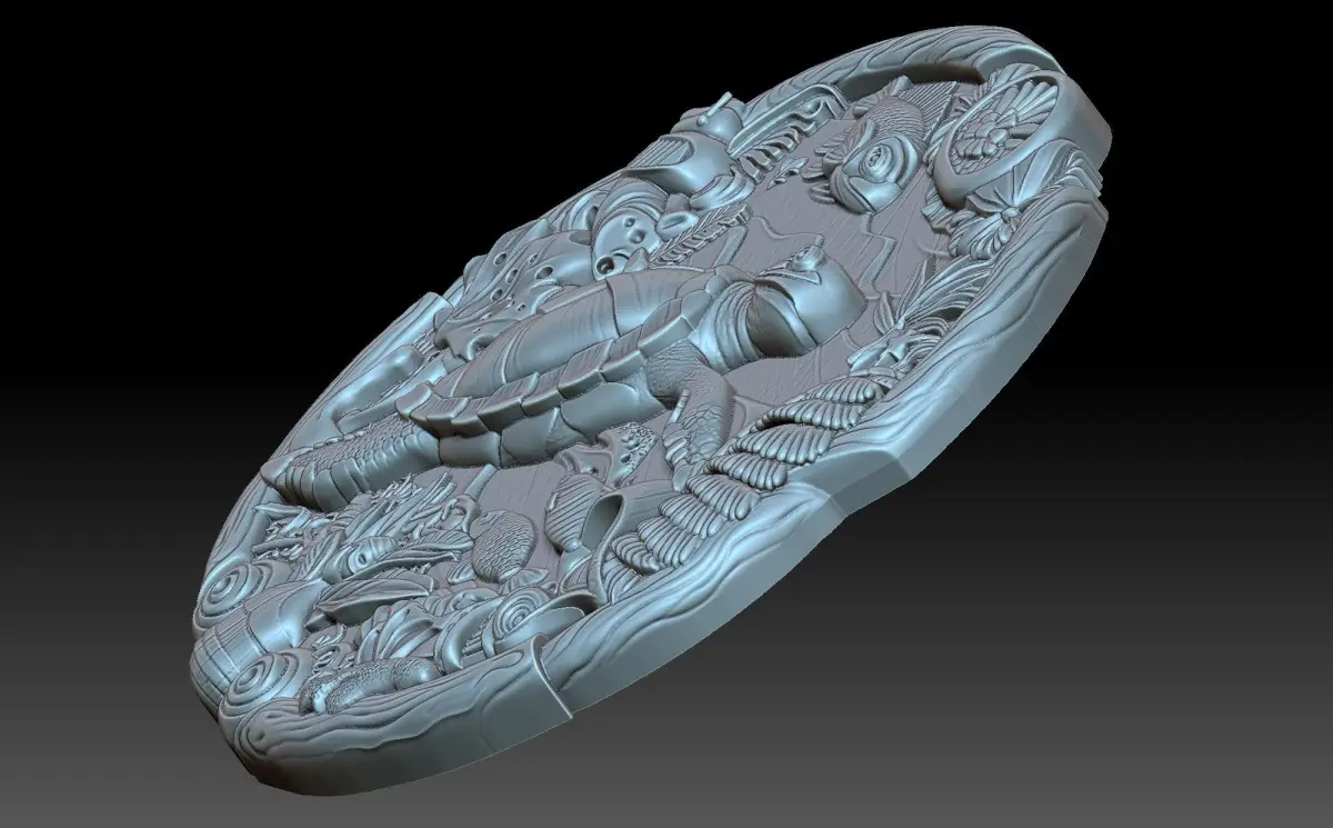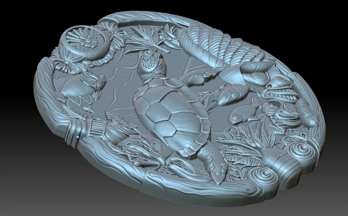 3d bas-relief compositions depicting a sea turtle, and in the background the sea and its entire underwater world and marine inhabitants. Beautiful and filled with details: shells, seaweed, fish and more. The work is suitable for 3D printing and CNC machine tools.