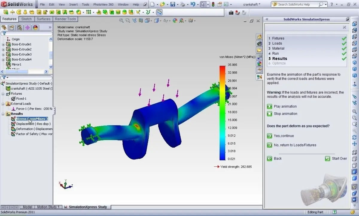 Simulation or an analysis of a crankshaft as to how much load it can bear and also the process to optimize the design.Original Solidworks part file has been uploaded so that you can use it or rectify it according to your own dimensions.