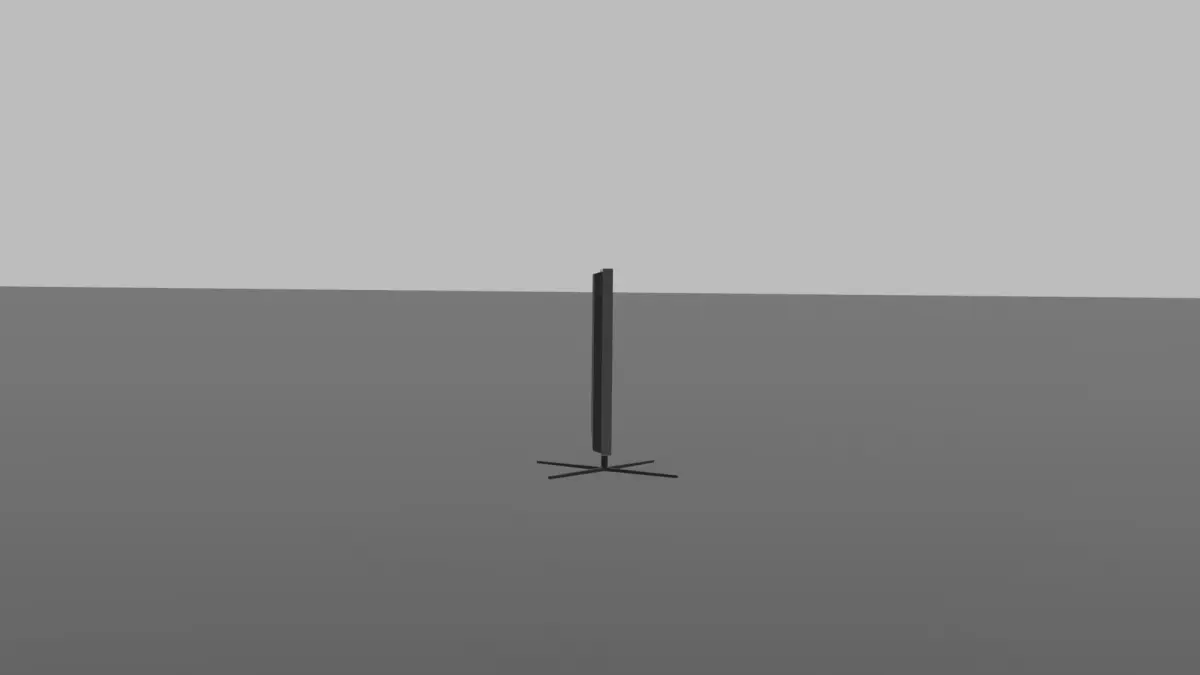 This is a modern flat-screen television featuring a minimalist design. The TV has a thin black frame and a wide, stable stand with multiple legs for support. It is set against a simple, two-tone background, highlighting its sleek and contemporary look. The screen is turned off, showing a smooth dark surface without any reflections or light spots.
