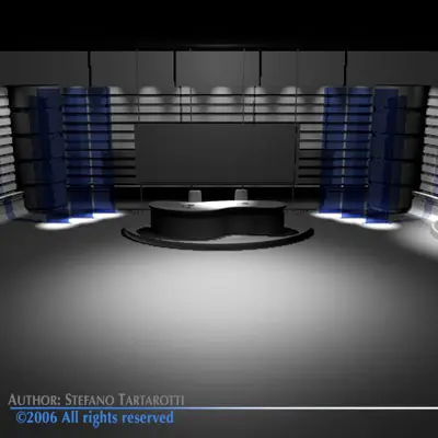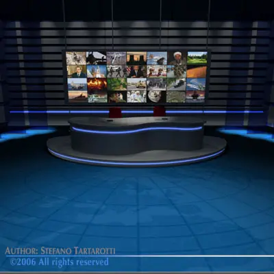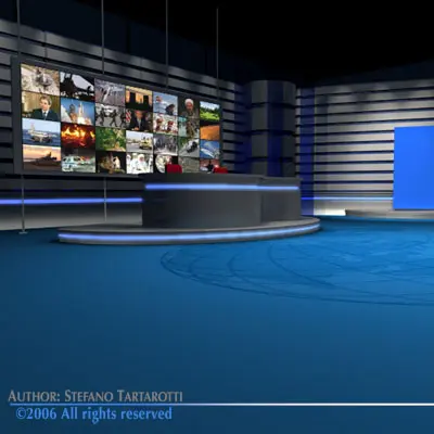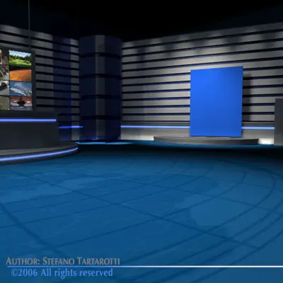 TV news studio with blue screen for weather set. Only cinema4D R10 format has materials and textures (as images). Other formats have enclosed in zip files only screens, floor and weather screen textures.