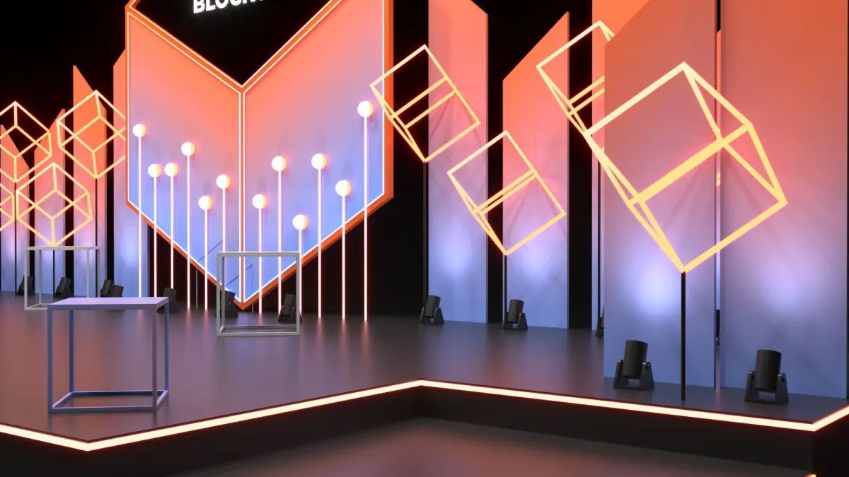 This 3D model features a futuristic stage setup inspired by blockchain aesthetics, with clean geometry, strong symmetry, and integrated lighting elements. Designed for talkshows, virtual events, and professional presentations.