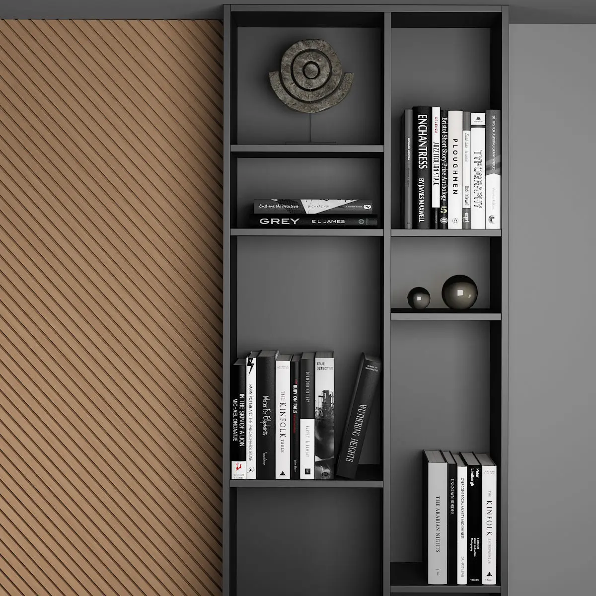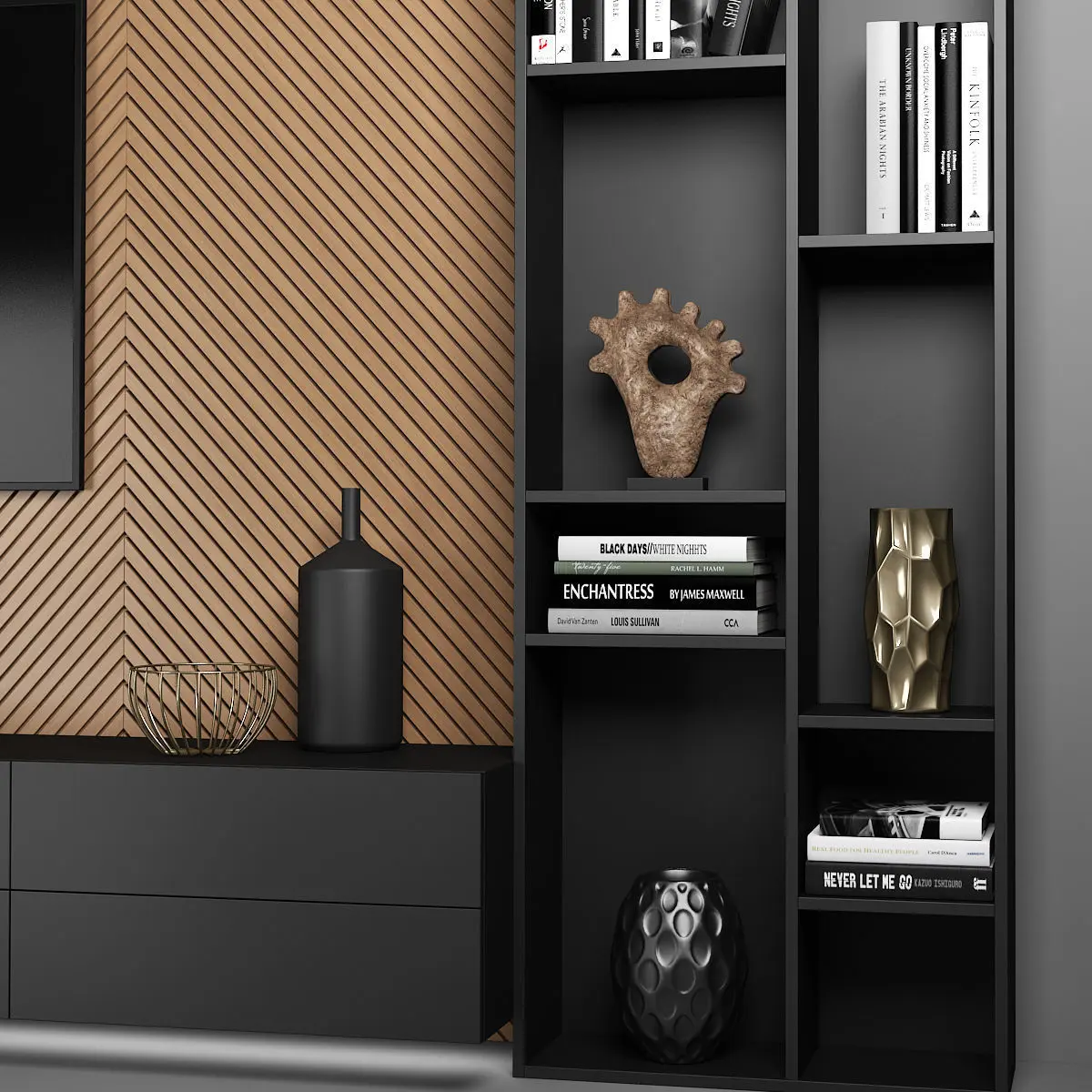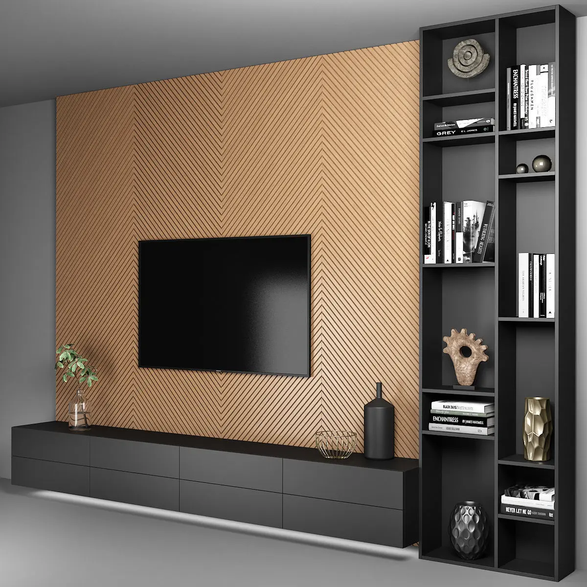 TV wall with decor.Dimensions: 4000 (W) x 3000 (H) x 450 (D) mmThe composition consists of separate grouped modules for easy editing.Render: V-Ray 2,20 Formats: 3ds Max 2010, FBX