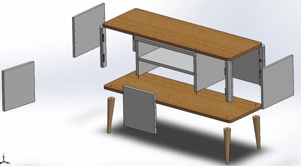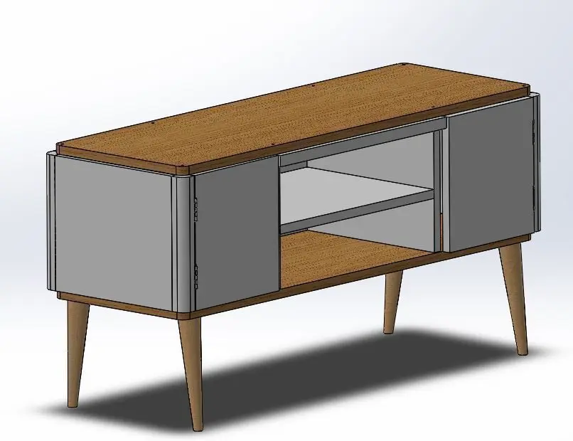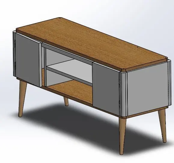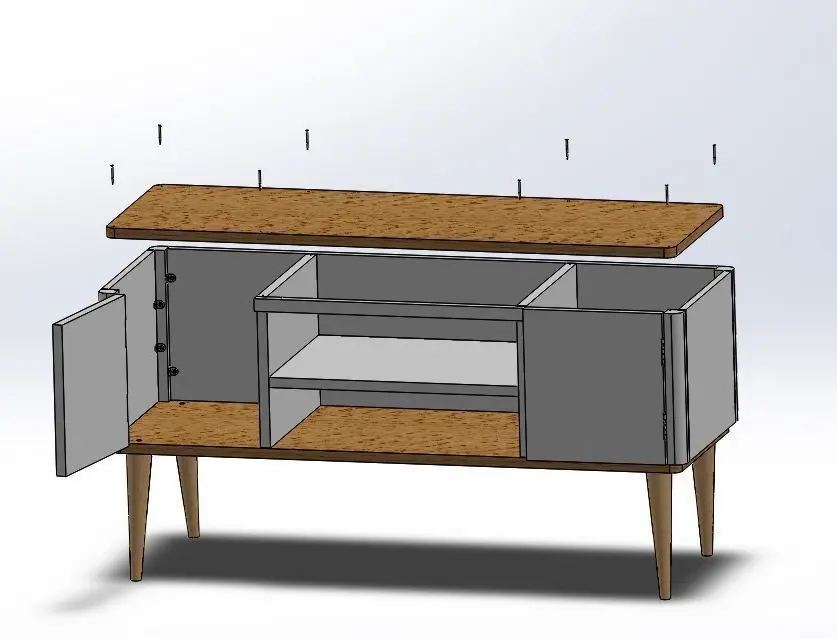 Modele d'assemblage SolidWorks étendu aux fichiers OBJ, FBX, STL. Ce fichier comprend plusieurs fichiers parmi les pieces suivantes: panneaux en bois, charnière, plaques de bois, pieds en bois poli puis toutes les vis