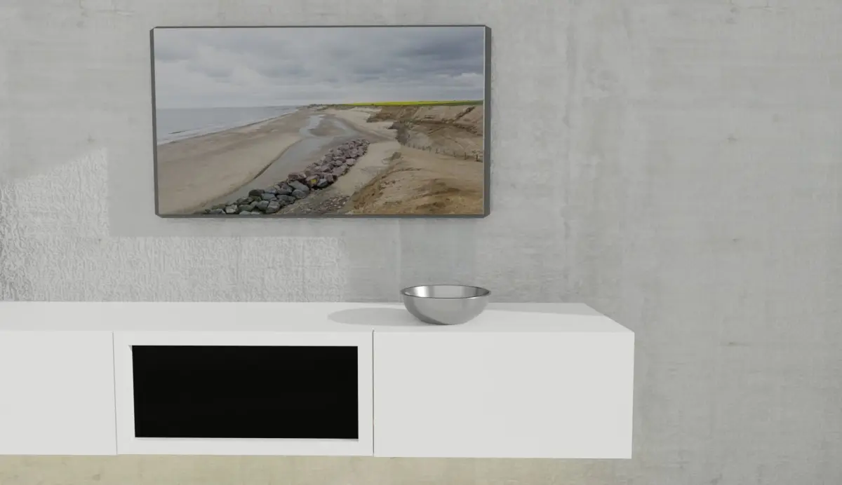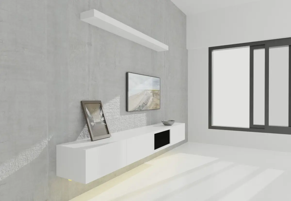 The above Tv unit design has a contemporary look that is unwrapped for easy modification. Besides the Tv unit the ,design also has a photoframe with editable photo plane.The same is with the tv where you can add the suitable image as per your requirement.The background has the concrete texture which complements the Tv unit . With proper lighting a Photorealistic look can be achieved as shown in the reference image.The Tv unit aslo has light at its base to highlight the tv unit.